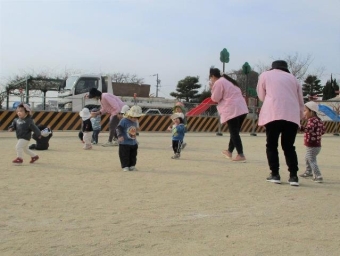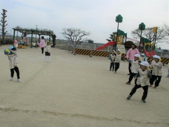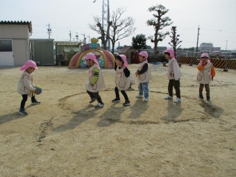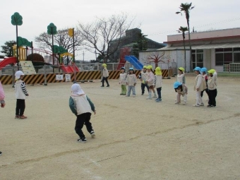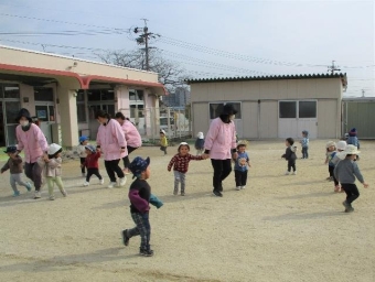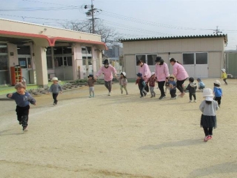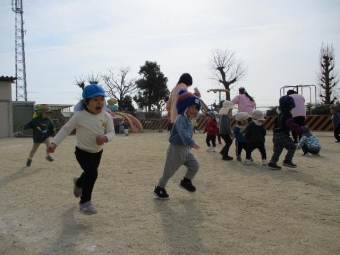 年中さんは鬼ごっこが大好き!友達と誘い合って園庭を元気いっぱい走っています!