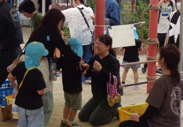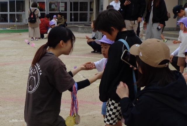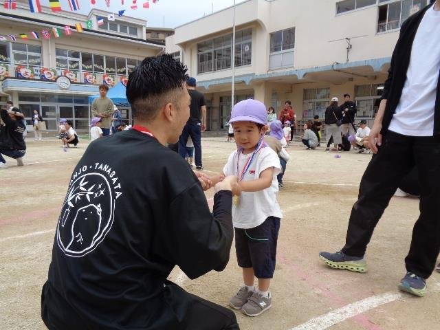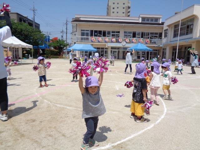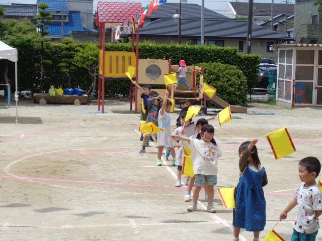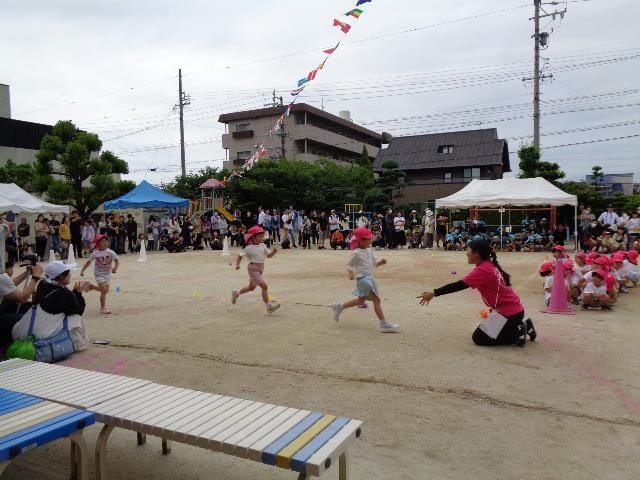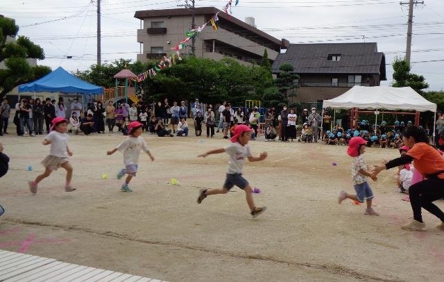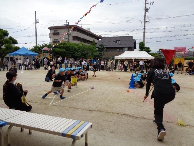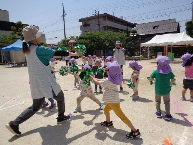 少し雨模様でしたが、開催時間には雨が上がり、無事プログラム通り運動会を執り行うことができました。子どもたちは、おうちの人に踊りを見てもらったり、一緒に体を動かして遊んだりすることをとても楽しんでいました。