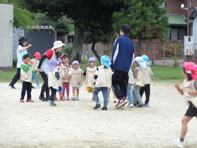 広場では、「花いちもんめ」や「お月様くぐるは」などのわらべうたで触れ合いながら遊びました。
