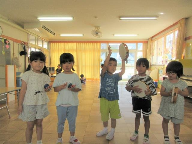 年少組は、カスタネット、タンブリン、鈴を使って楽器遊びをしました。