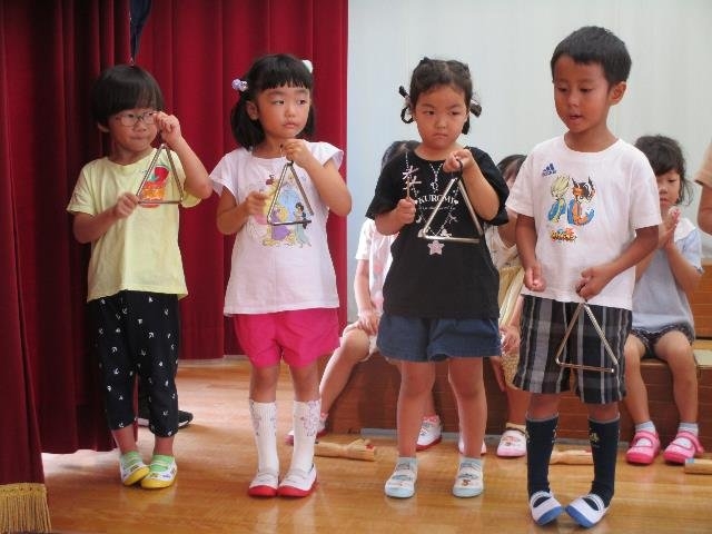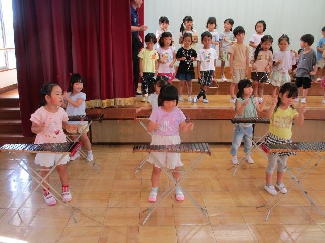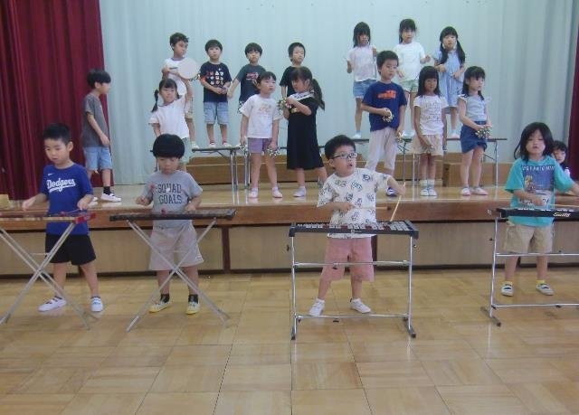 年中組は、カスタネット、タンブリン、鈴に加えて、木琴やウッドブロック、トライアングルを使って合奏しました。自分の楽器だけでなく、友達の楽器の音を聞いて音を合わせる面白さを感じながら合奏することができました。