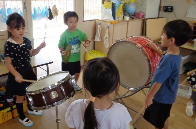 年長組は、さらに大太鼓や小太鼓、鉄琴が加わります。