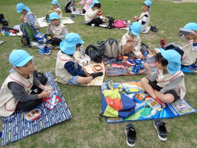 年中・年長さんは末広公園に移動し、お弁当を食べました。
