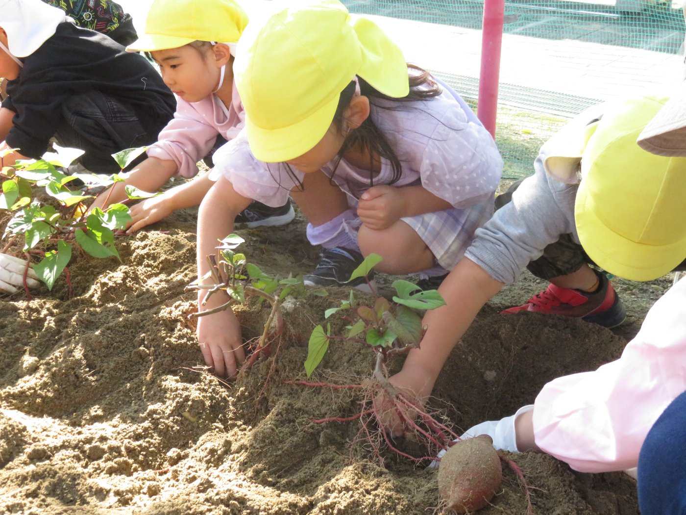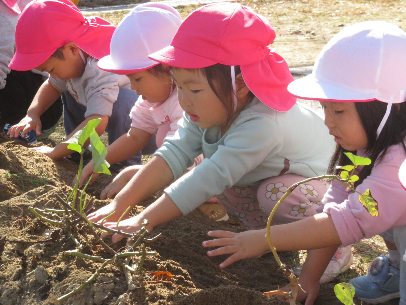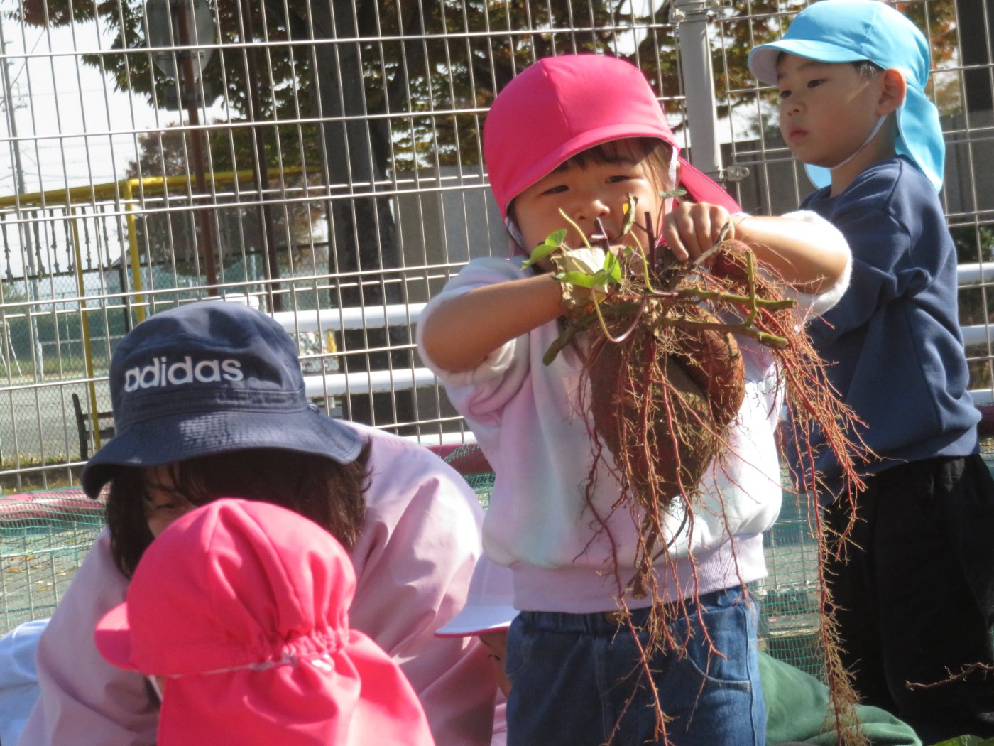 保育園の畑で育てていたサツマイモを収穫しました。「全然出てこない・・・」と初めは少し苦戦していましたが、少しずつ掘り進め、サツマイモにたどり着くことができました。「大きなお芋があったよ!」「小っちゃなお芋がいっぱいくっついてるね~」と興奮した様子の子どもたち。収穫したサツマイモは、12月3日(水)に「サツマイモの茶巾絞り」をして食べました。子どもたちは「ふかしたお芋さん、あったかいね~」「いい匂いがする!早く食べたいなぁ」と食べるのを楽しみに作っていました。出来上がった茶巾絞りをみんなで美味しくいただきました。