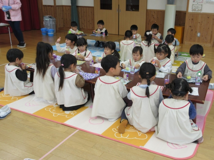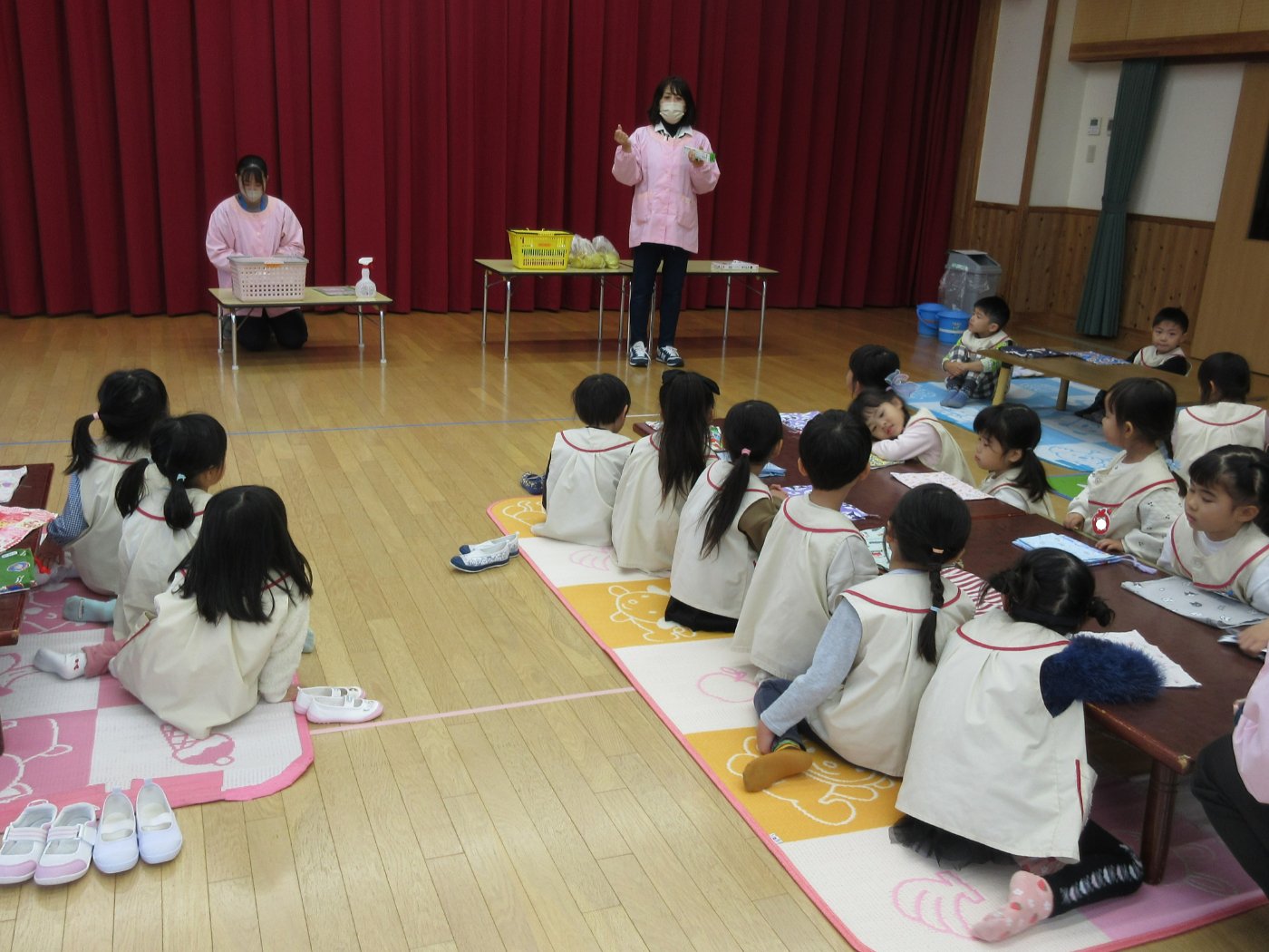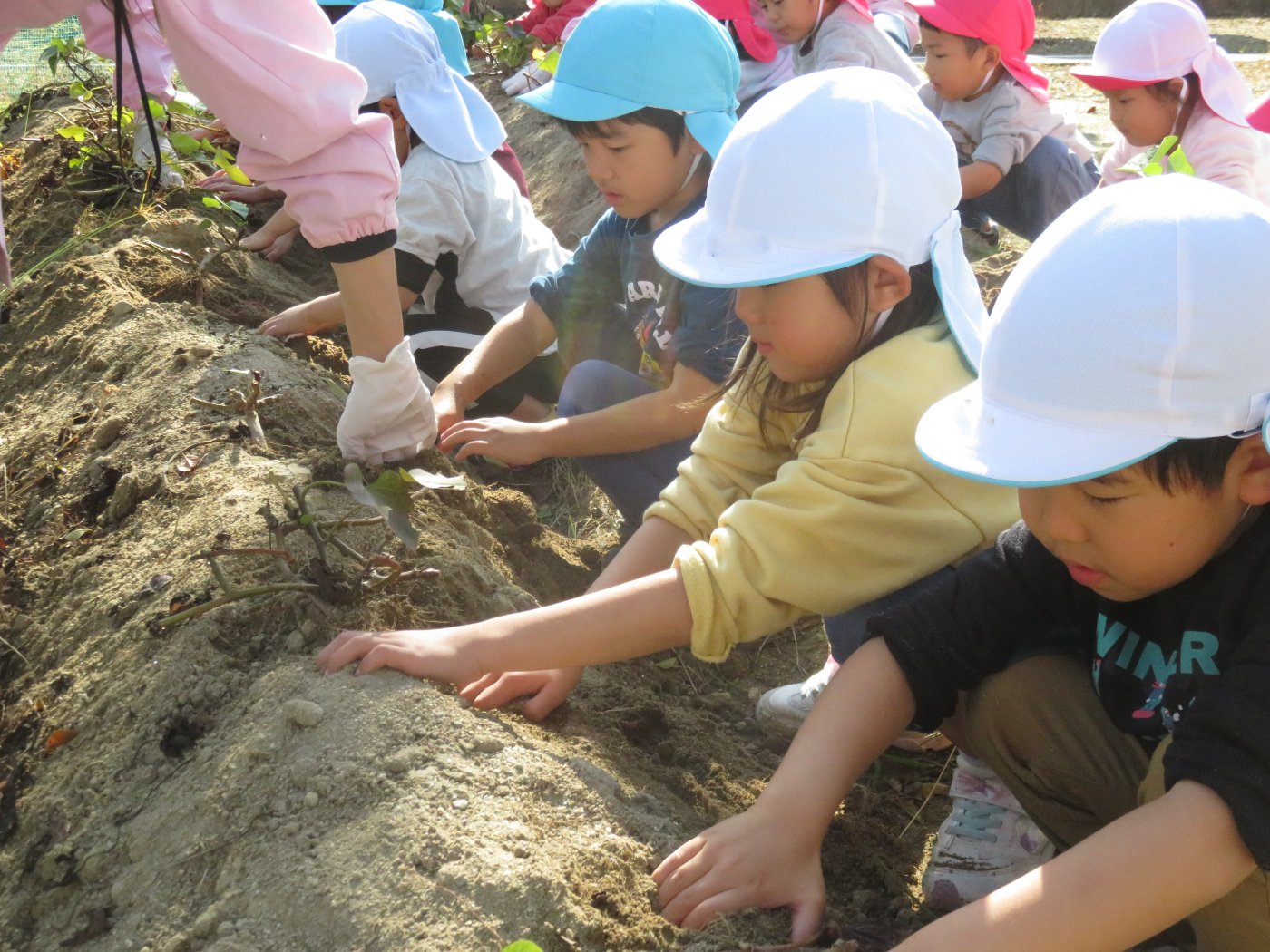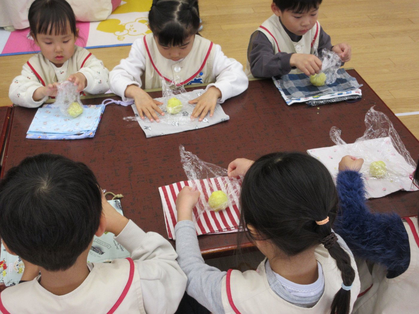 保育園の畑で育てていたサツマイモを収穫しました。「全然出てこない・・・」と初めは少し苦戦していましたが、少しずつ掘り進め、サツマイモにたどり着くことができました。「大きなお芋があったよ!」「小っちゃなお芋がいっぱいくっついてるね~」と興奮した様子の子どもたち。収穫したサツマイモは、12月3日(水)に「サツマイモの茶巾絞り」をして食べました。子どもたちは「ふかしたお芋さん、あったかいね~」「いい匂いがする!早く食べたいなぁ」と食べるのを楽しみに作っていました。出来上がった茶巾絞りをみんなで美味しくいただきました。