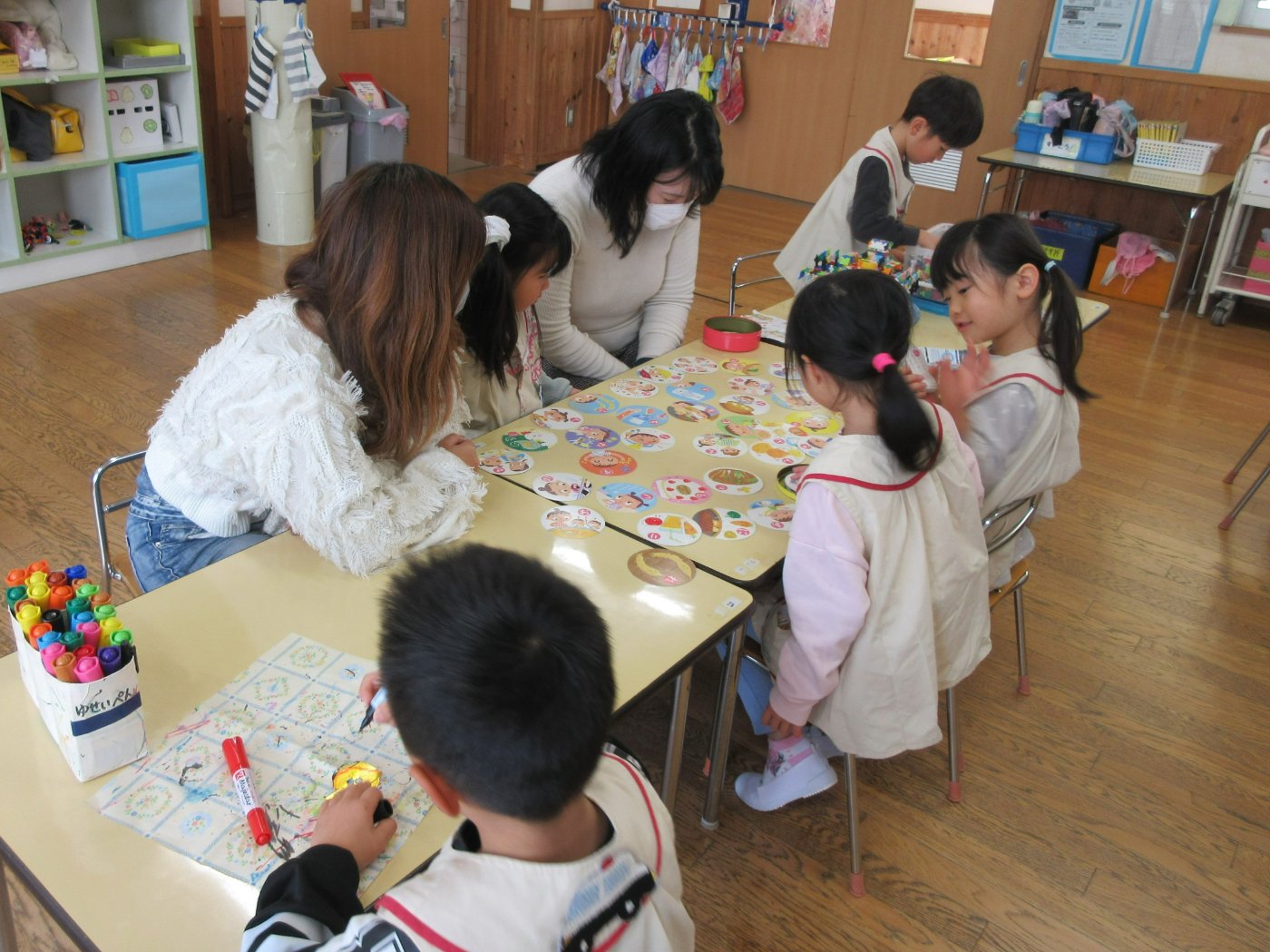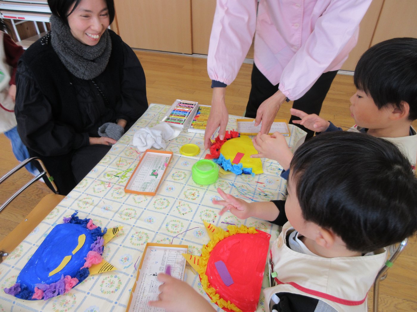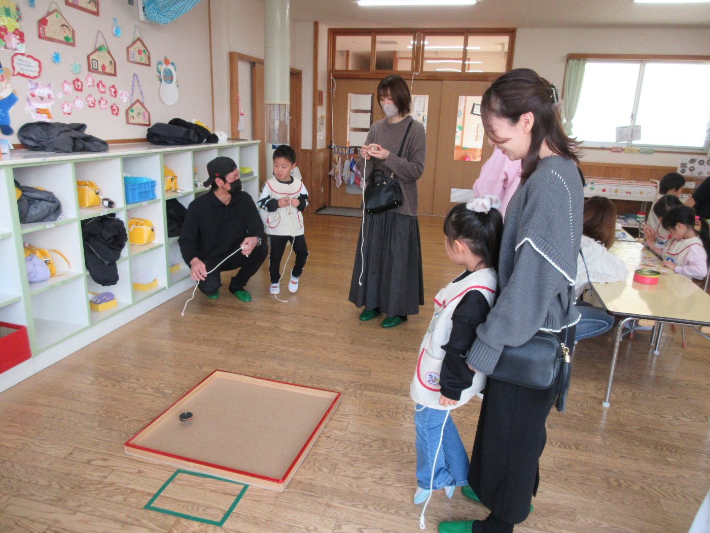 1月13日(火)~16日(金)に幼児組保育自由参加がありました。室内ではカルタとりやこま回し等の正月遊びをしたり、豆まき会で被る鬼のお面作りをしたりしました。戸外では凧揚げ、バナナ鬼、しっぽとり等の遊びを保護者の方も子どもと一緒になって遊びました。あちこちで笑い声が響く、笑顔いっぱいの保育参加となりました。