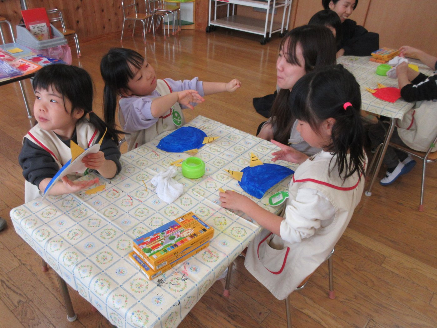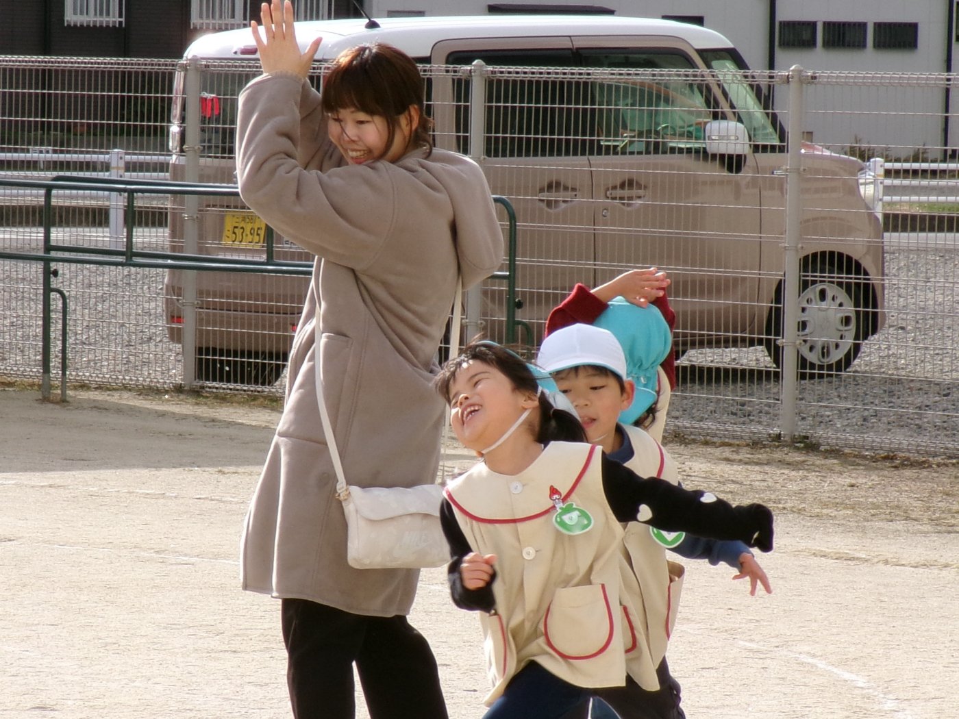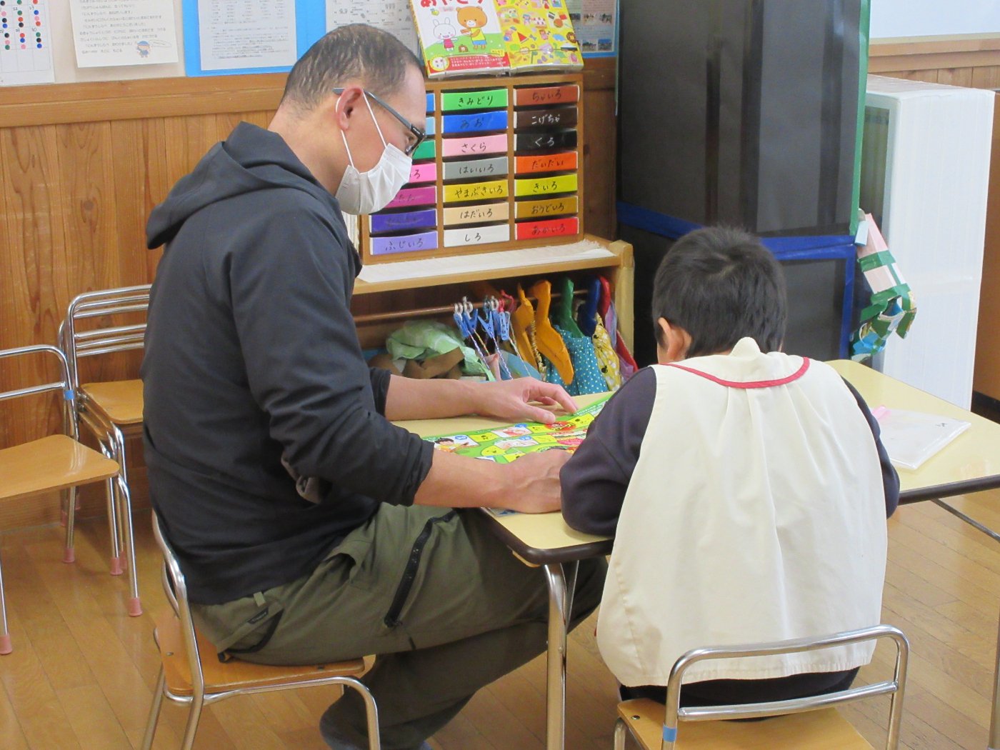 1月13日(火)~16日(金)に幼児組保育自由参加がありました。室内ではカルタとりやこま回し等の正月遊びをしたり、豆まき会で被る鬼のお面作りをしたりしました。戸外では凧揚げ、バナナ鬼、しっぽとり等の遊びを保護者の方も子どもと一緒になって遊びました。あちこちで笑い声が響く、笑顔いっぱいの保育参加となりました。