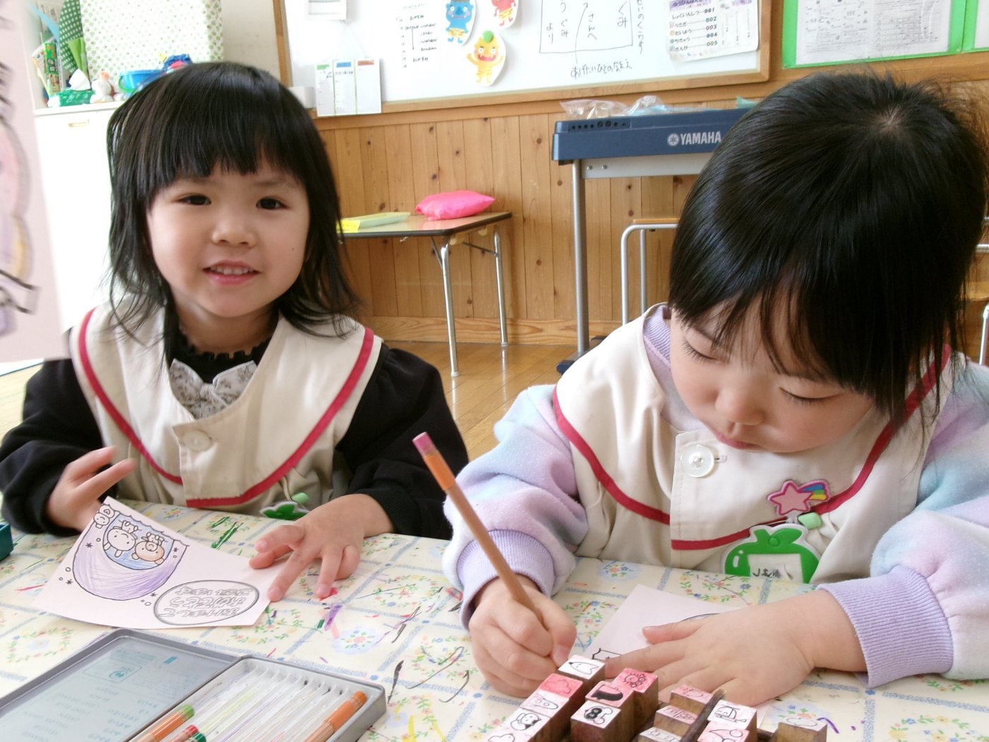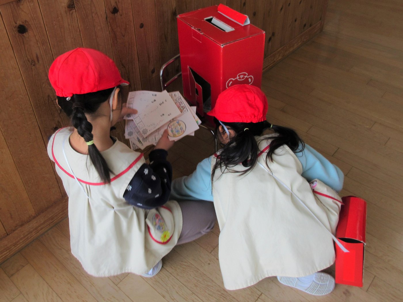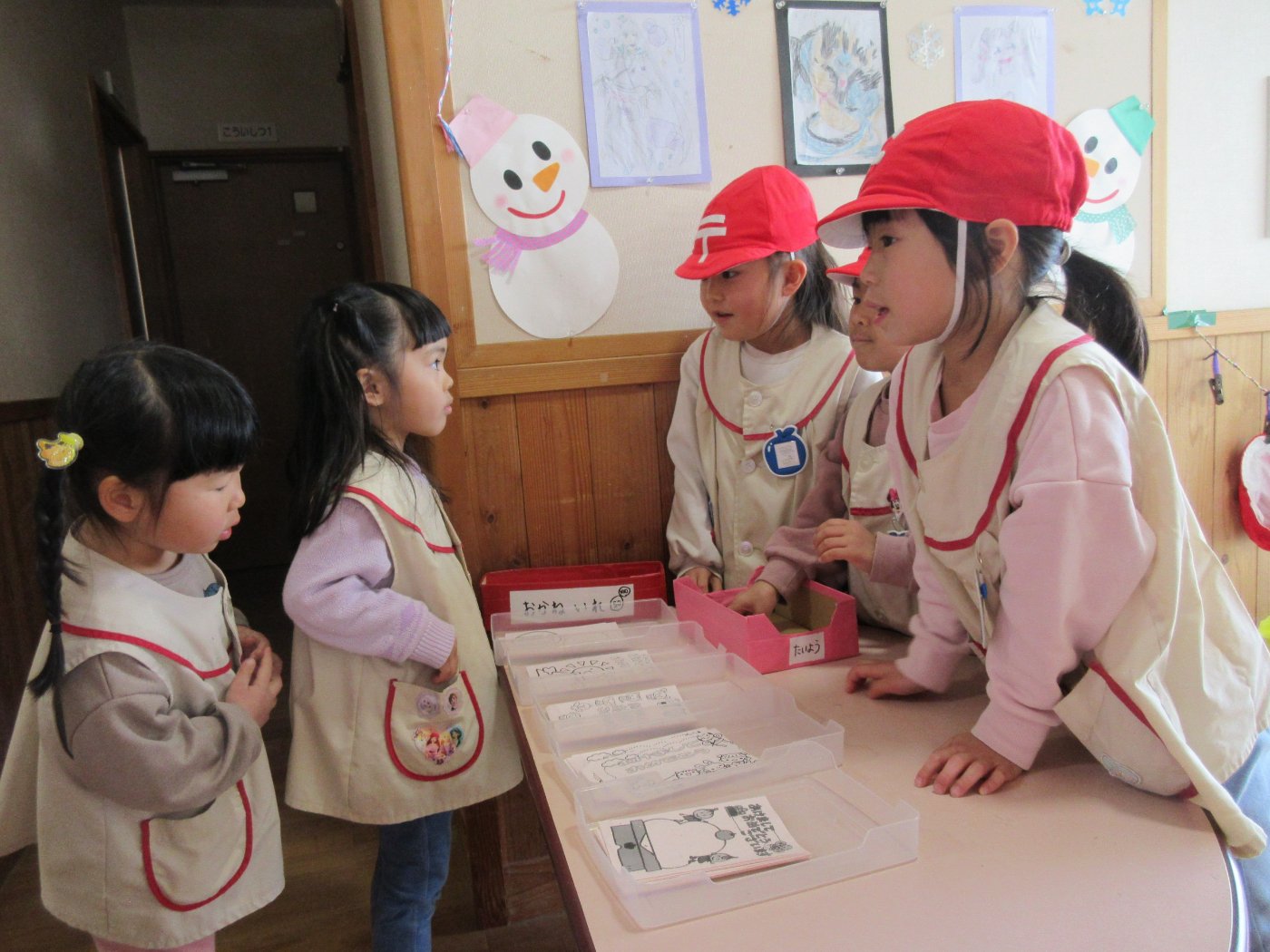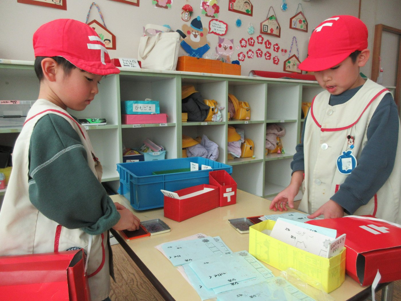 年長組が郵便屋さんになって、郵便ごっこをしました。年少・年中組の子どもたちは、自作の100円を払ってぎんが組郵便局で年賀はがきを買うこと、「○○ちゃんに出そう!」「誰かから届くかなぁ・・・」と年賀状のやりとりをすることをとても楽しんでいました。いつも遊んでいるクラスの友達だけでなく、異年齢ペアの子や先生宛てに年賀状を出す子もいました。はがきを出す相手を思いながら、塗り絵をしたり宛名を書いたりする子どもたちの姿にほっこりしました。