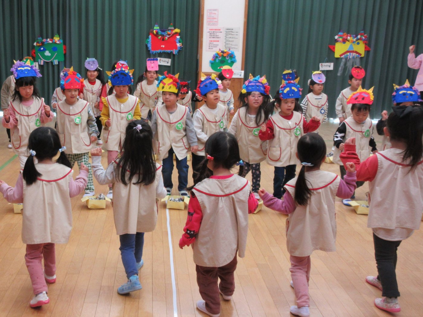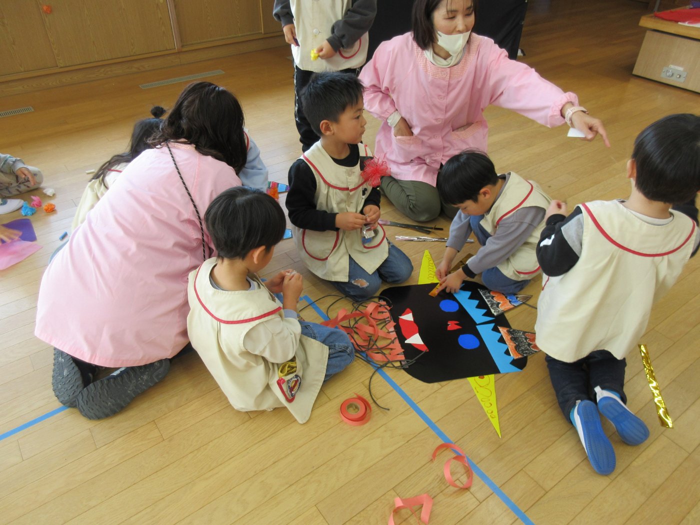 2月3日(火)は豆まき会がありました。今年は、自分で被る鬼のお面だけではなく、年長児は顔、年中児は目と鼻と口、年少児は角と耳を作り、髪の毛等の仕上げは、異年齢グループで協力して大きな鬼も作りました。それぞれのグループで『泣き虫鬼』や『怒りんぼ鬼』等、やっつけたい鬼の名前をつけて豆まき会に挑みました。