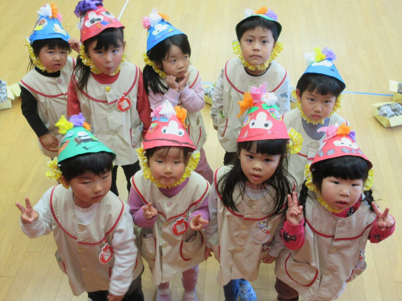 豆まき会当日は、ペープサートで豆まきの由来を見た後、新聞紙で作った豆を鬼に向かって投げました。低年齢児クラスの子どもたちも一緒になって「鬼は~外!福は~内!」とみんなで作ったたくさんの鬼たちに目掛けて力強く新聞豆を投げることができました。豆まきが終わった後は「全部の鬼に豆を投げたよ!」「これで鬼はいなくなった~!」と満足そうな表情の子どもたちでした。