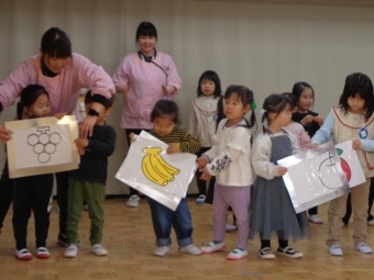 年長児がお店屋さんになり、年中児・年少児がペアになってお店をまわりました。年長さんは、お店屋さんになりきって「いらっしゃいませ」「シールここにはるね」「こちらでおまちください」などと、声をかけていました。