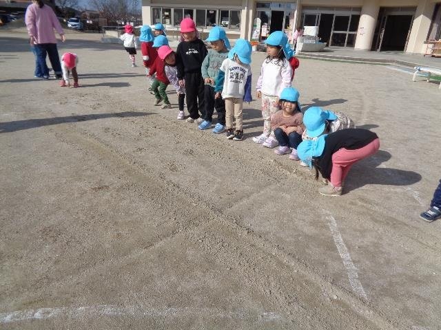 今年の年中児の遊戯は、大きな旗を両手にもって踊りました。遊戯室や保育室がなるべく広い環境になるように工夫したのですが、旗が大きくどうしても動きは小さくなってしま子どもたち。戸外に出れるようになると伸び伸びと体を大きく使ったり、手をピンピンに伸ばしたりし、ダイナミックに旗を振る音が演技中に聞こえてくるようにまでになりました。