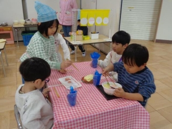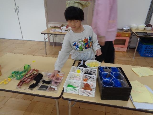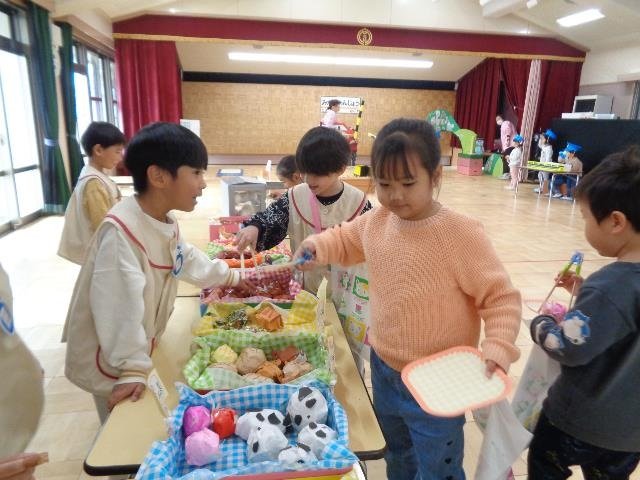 クラスごとに色々なごっこ遊びがとても盛り上がっています。そこで、いつも年長さんが店員になって行っていたお店屋さんごっこを自分たちのクラスのごっこ遊びをお店にし、みんなでお店屋さんになりきって遊びました。お客さんと店員さんに分かれ、どちらの役もとても楽しそうにやり取りをしていました。