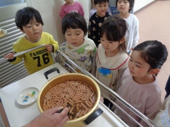 年中・年少児も「なんかおいしいにおいがするね」「早くカレー食べたいね」と期待いっぱいで、年長児の調理体験やカレーのお鍋の様子を見に行っていました。