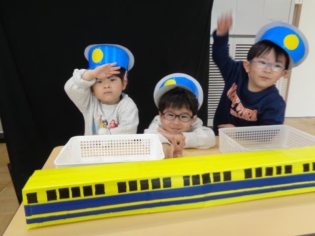 年少さんは、乗り物屋さん。「チケットください」「カンカンカンカン、お待ちください」と駅員さんになりきっていました。