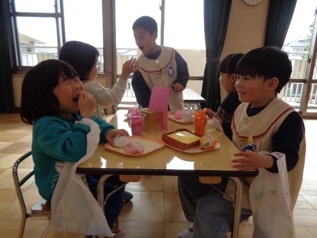 夏祭り会後は、「夏祭り会、楽しかったね!!」「かんぱーい」とジュースとお菓子を食べました。