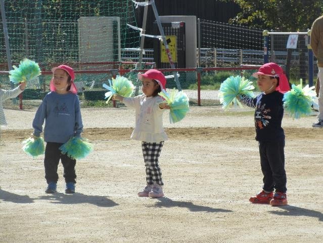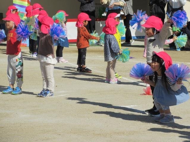 ポンポンを持っての踊り。笑顔の子、真剣な表情の子など、それぞれが楽しみながら初めての運動会に参加できました。