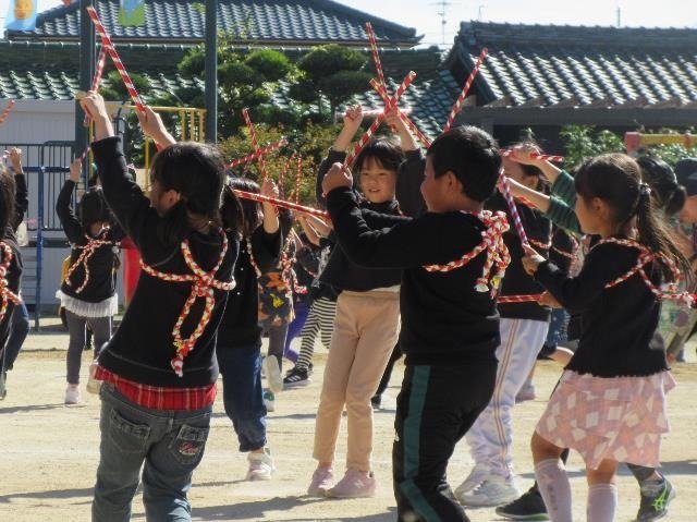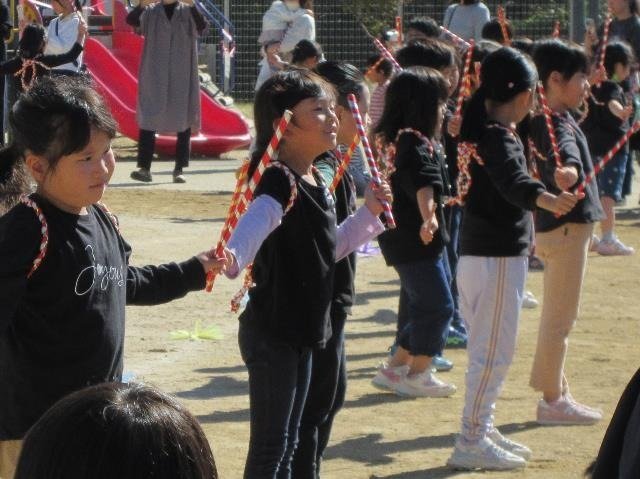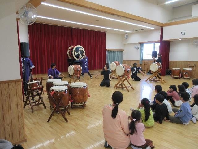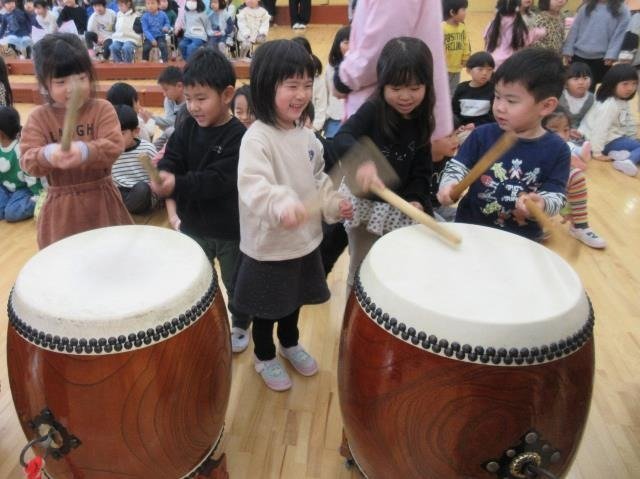年長児はバチを持って踊りました。「格好良く!」「みんなで動きを合わせて!」楽しいだけでなく目標をもって踊れました。