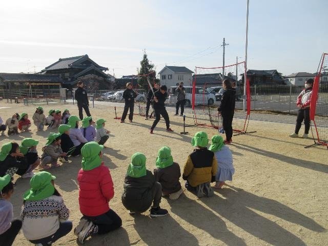 次にバッティング。実際の選手の素振りに「すごい!」「ブンって聞こえた!」と園児たちは大興奮。子ども用ティーバッティングでバットがボールに当たると「やった!」「すごいね!」と歓声があがりました。