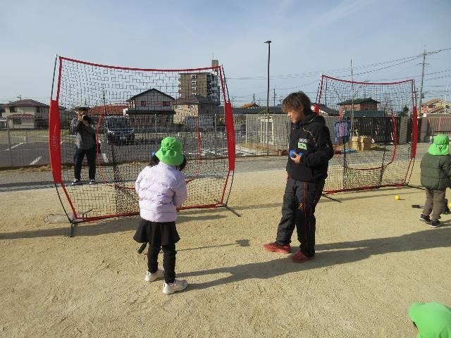 ボールの握り方、投げ方を教えてもらってストラックアウトに挑戦。園児が狙い通りに投げられると、「やった~!」とハイタッチ!選手のみなさんも一緒に喜んでくれました。