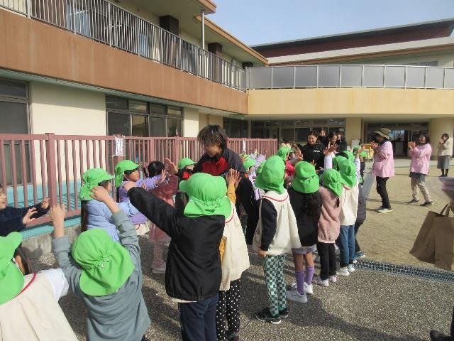 楽しい時間の最後はピエロのタックさんとタッチをしてもらって嬉しそうな子どもたち。「また、遊びに来てね」と元気に挨拶できました。
