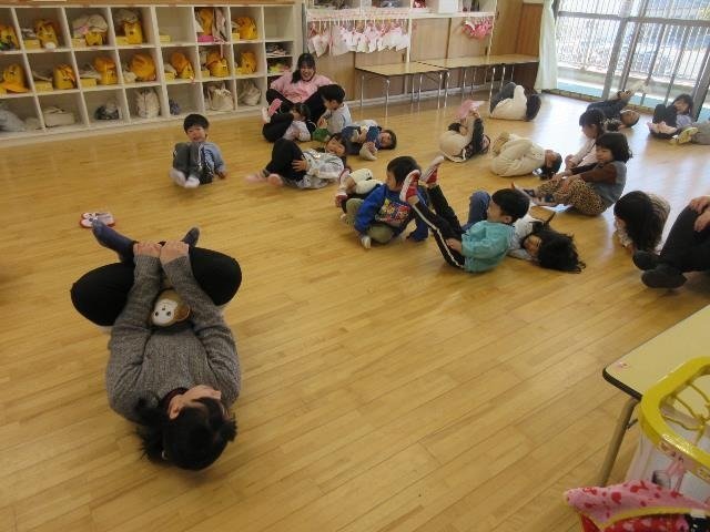 今度はみんなでだるまさんになって横にユ~ラユラ。後ろにごろんと転がり、組んだ足を持って勢いをつけて起き上がります!これがとっても難しい!!日々の遊びのなかに取り入れていきたいと思います。