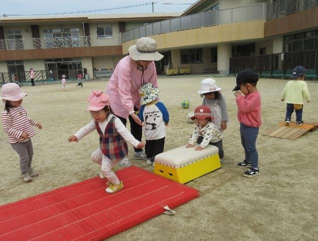 りんご組(2歳児)の様子をお知らせします。いろいろなサーキット遊びを楽しんでいます。ケンパをしたりくぐったり渡ったり、ジャンプをしたりして元気いっぱいです。体を動かす楽しさを味わえるように設定しています。