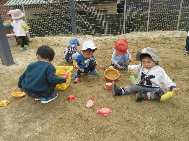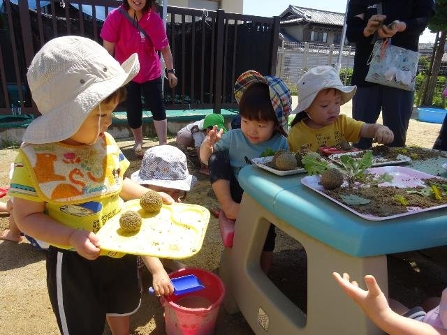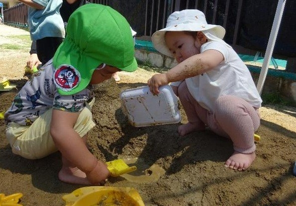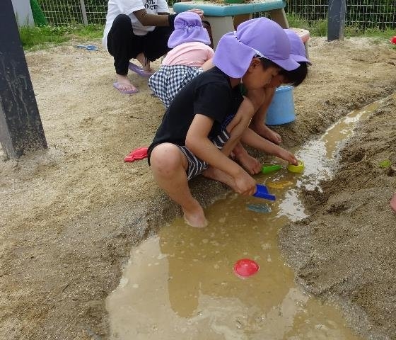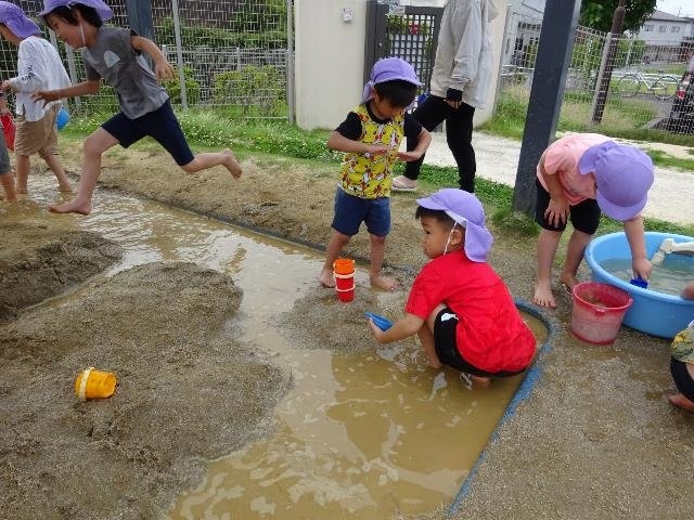 戸外では、泥んこ遊びや水遊びを楽しんでいます。遊びの中で泥や水に触ったり、泥の感触を楽しんだり、水の流れる様子を見たり、いろいろな経験をしています。子どもたちの「やってみたい」気持ちに寄り添い、この季節ならではの遊びを十分に経験できるようにしています。