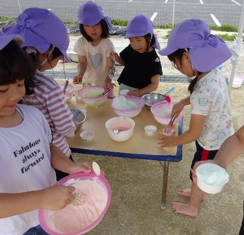 年長児は、滑り台に水を流して「ウォータースライダー」を楽しんでいます。「滑るよ!」「次は私の番」と順番に交替して楽しんでいます。足風呂では、タライに足を入れて「気持ちいいね」「スタバ女子会をしよう!」とおしゃべりが盛り上がっています。毛糸や水遊び用のストーンを組み合わせて美味しそうな料理を作っている子もいます。