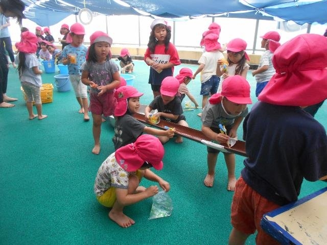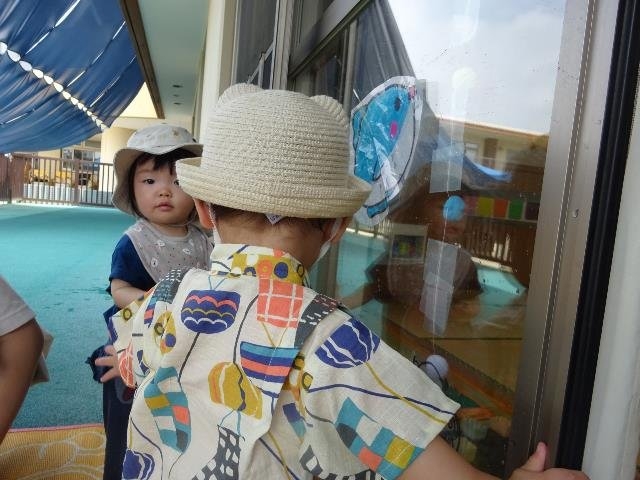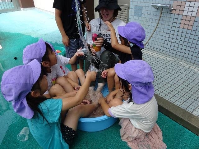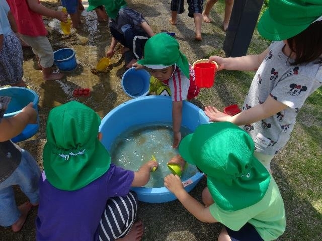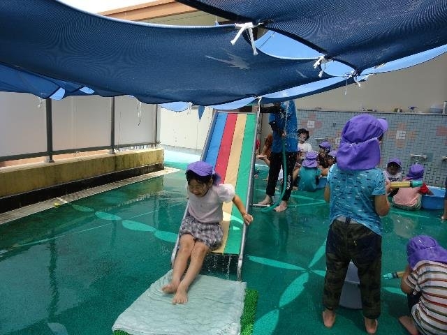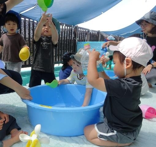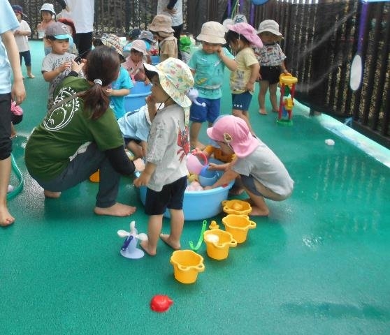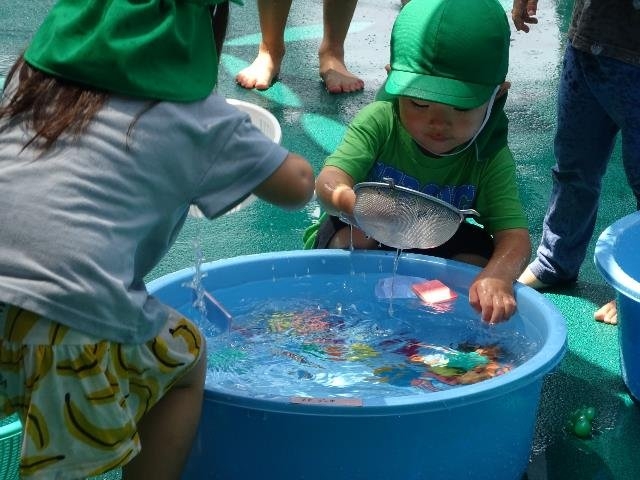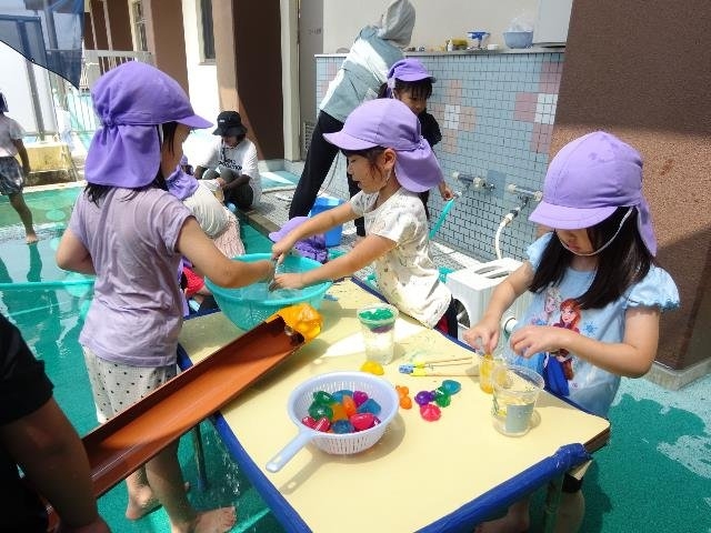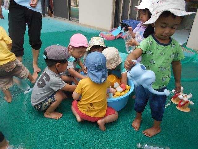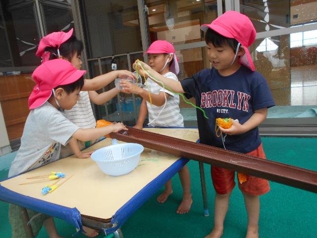 園庭の暑さ指数が29を超える日が続いています。幼児クラスは、園庭より涼しい2階のテラスで、水遊びをしています。水の冷たさを感じられる楽しい活動になっています。年少児は水鉄砲・玩具拾い・そうめん流し・スプリンクラーの水で遊んでいます。水遊び用のストーンを網ですくって金魚すくいごっこも楽しそうです。