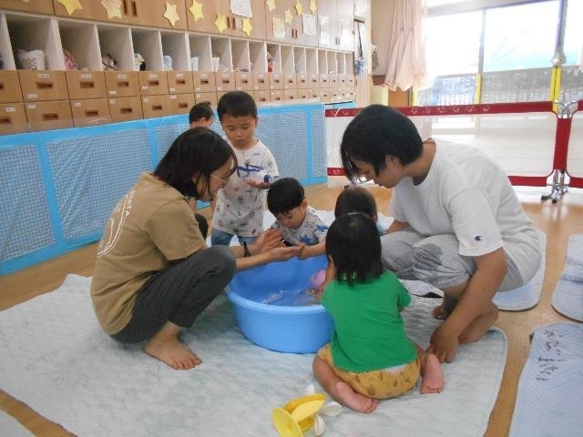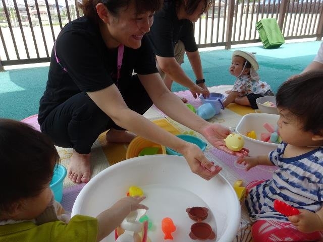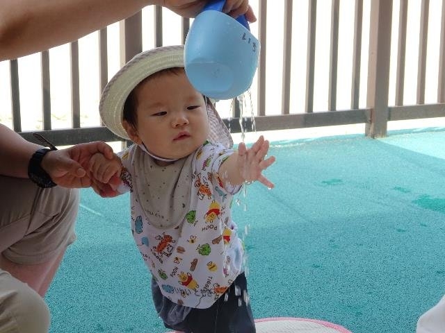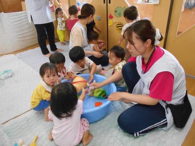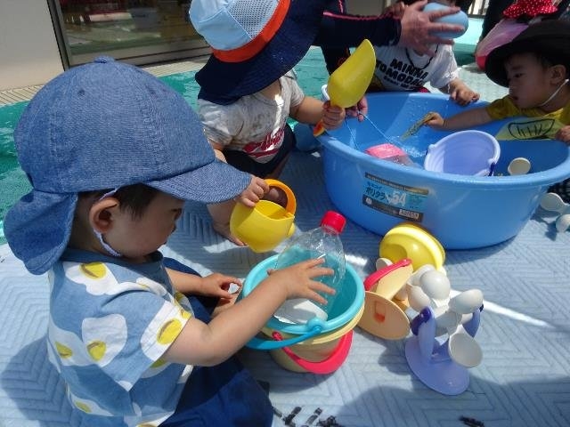 0歳児のクラスでは、タライにそっと手を入れ、水に触れて気持ちよさそうです。タライの中の玩具を取ったり入れたりして保育者に見せて喜ぶ姿もあります。暑い日は大きなビニールに水を入れ「ウォーターベット風」にして涼しい遊びを楽しんでいます。※気温に合わせて、常温の水とぬるま湯を使って遊んでいます。