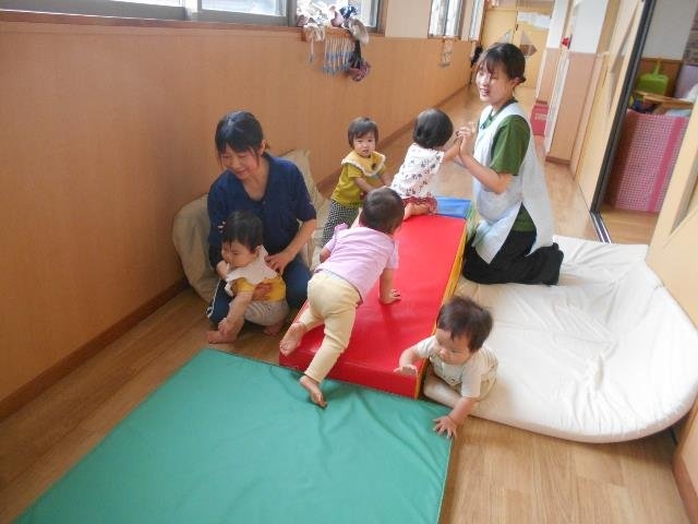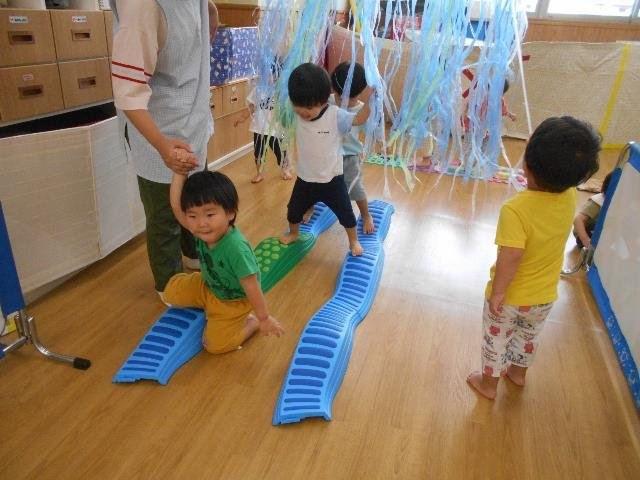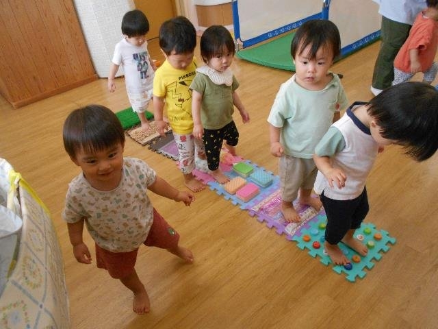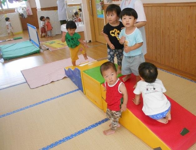 ばなな組(1歳児)の様子をお知らせします。サーキット遊びが大好きな子どもたち。登る、下りる、バランスをとるなどの運動遊びを通して、筋力や柔軟性を養い、身体能力を向上させます。また、伸び伸びと体を動かすことは、心身の健やかな成長や発達につながります。