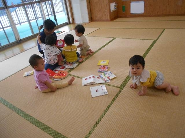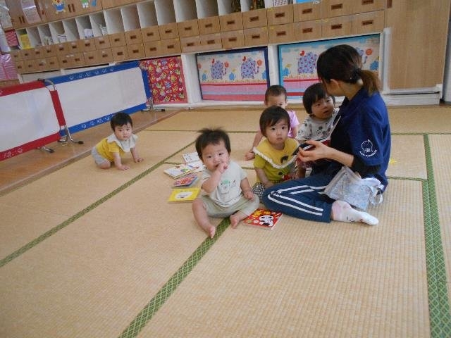 いちご組(0歳児)の様子をお知らせします。保育者が絵本を持つと側に寄ってきて嬉しそうな子どもたち。「見せて!見せて!」と声が聞こえてきそうです。絵本にたくさん触れ、心を豊かにし、想像力を養っています。