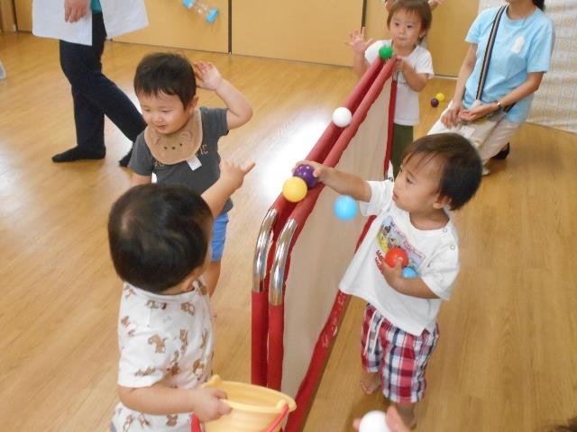 ぶどう組(1歳児)の様子をお知らせします。ボール遊びでは、壁の穴にボールを通して友達に渡したり、ボールを投げて的に当てたり、溝をつくって転がしたりして楽しんでいます。ボール遊びは視覚と触覚の運動感覚の刺激につながります。