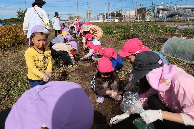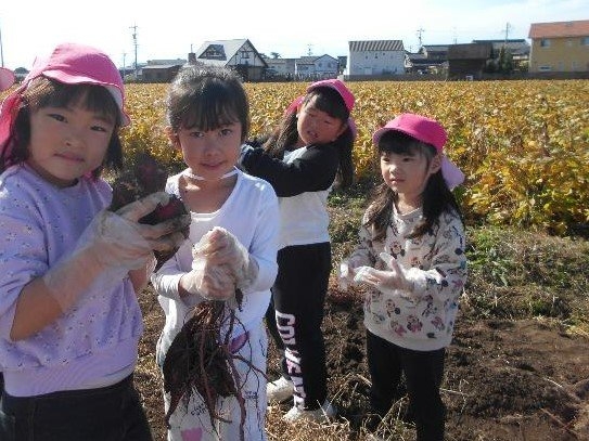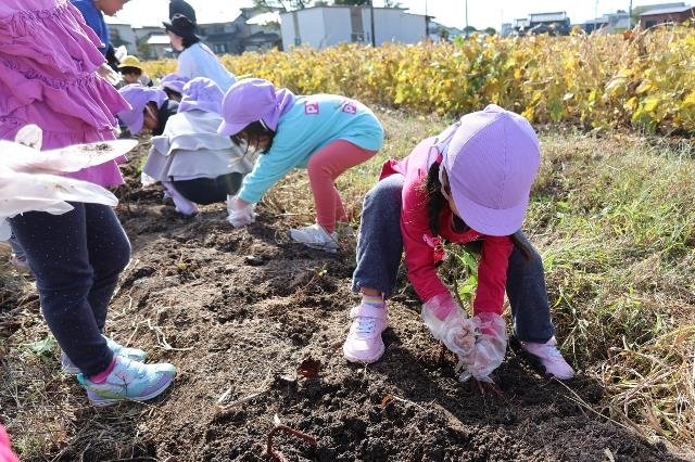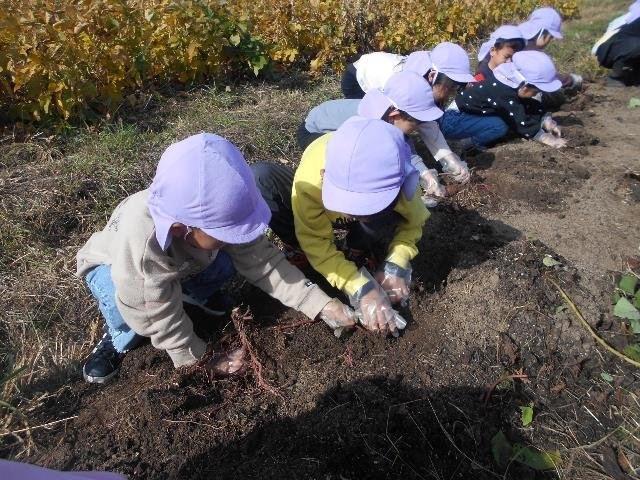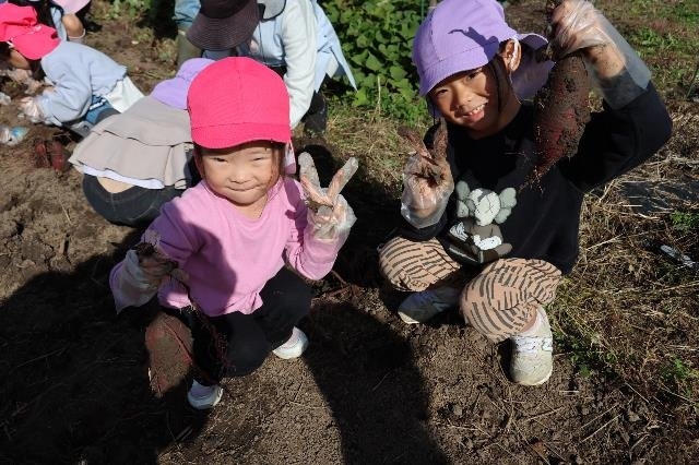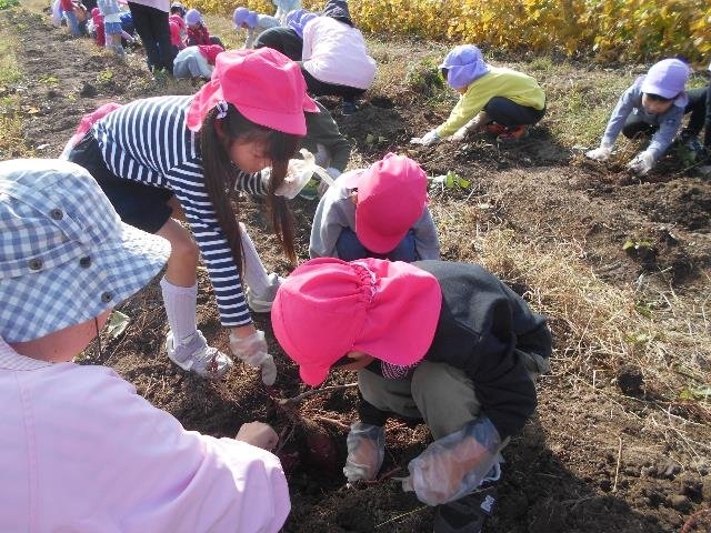 年長と年中の子どもたちがさつまいもほり体験(リーフさん)をしてきました。「たくさん見つけたいな」「ここに大きい芋があるよ」「掘れないから手伝って!」と友達同士で協力し合って楽しそうに芋を掘る姿が見られました。