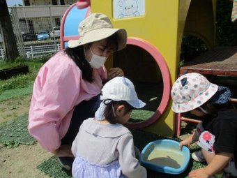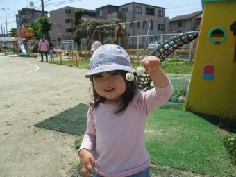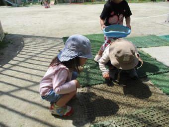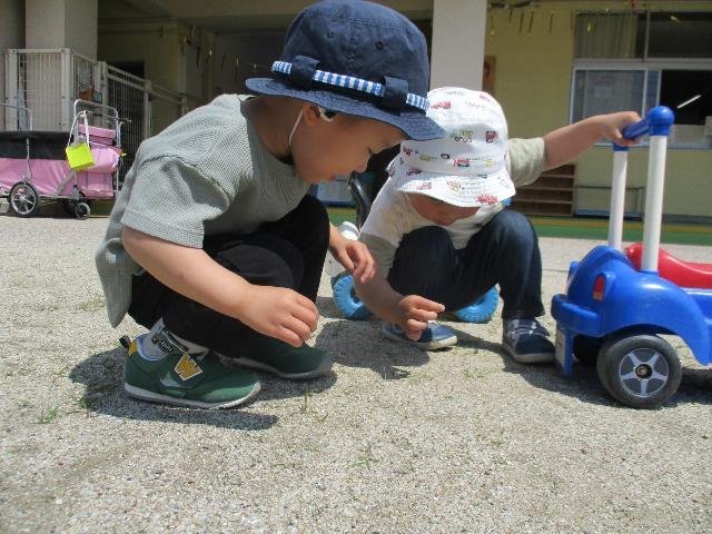 園庭に出た子どもたちは、「今日もダンゴムシ探そう」と先生や友達を誘って、走り出していきます。見つけたダンゴムシを嬉しそうに見ています。また、幼児組が育てている野菜を見たり、シロツメクサを摘んだりして喜ぶ姿も見られます。