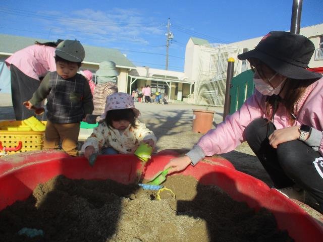 幼児期は人格形成の基盤となるため、様々な遊びを通して人と人とのつながりを深め人と関わる力を育めるようにしています。安心できる環境の中で保育者や友達と関わって遊んでいる様子をお知らせします。