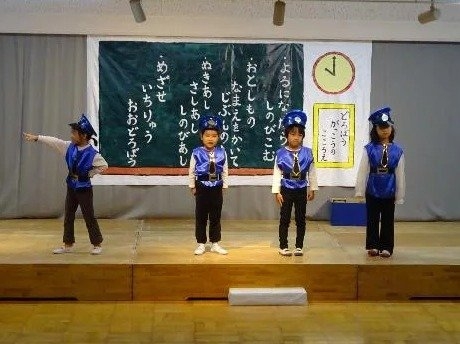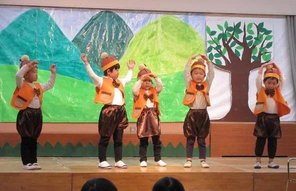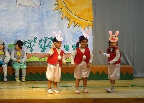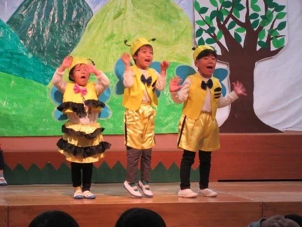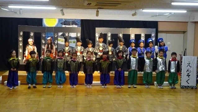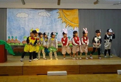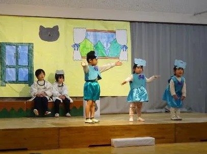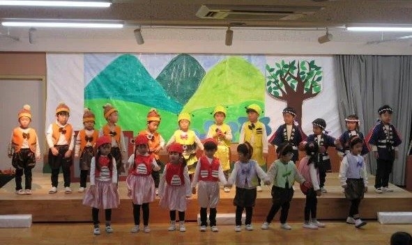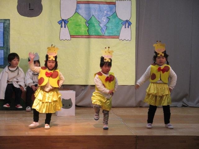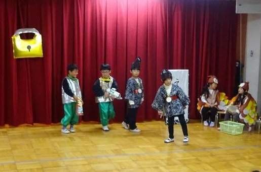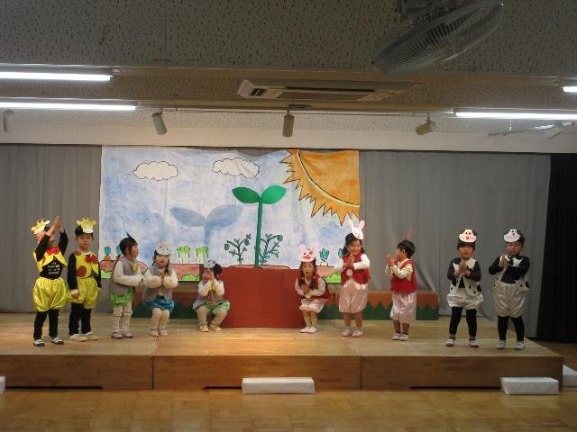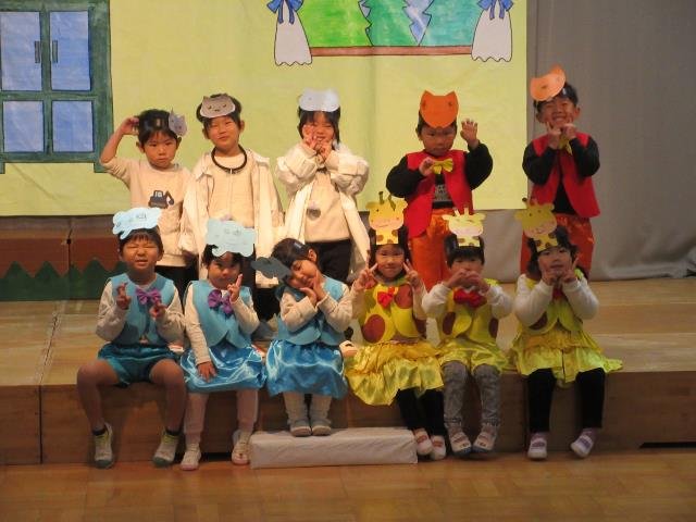 年中さんは、劇ごっこの楽しさが分かり、ドキドキしながらもお客さんの前で友達と一緒にセリフを言ったり、踊ったりする姿が見られました。それぞれの役同士で言葉のやりとりをしながら演じ、表現することの楽しさを味わいました。