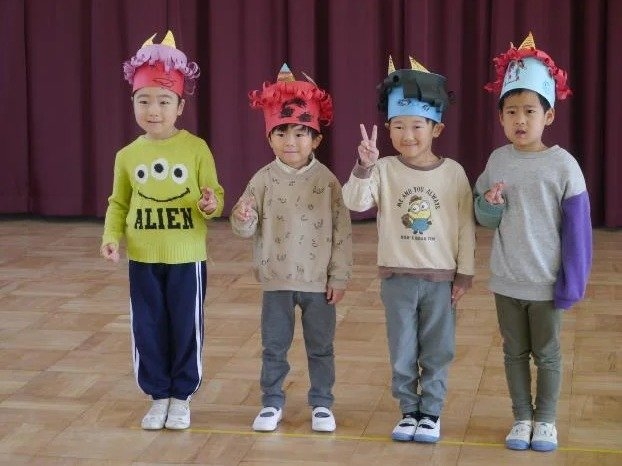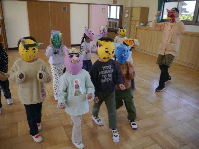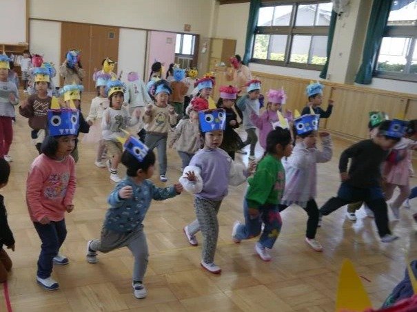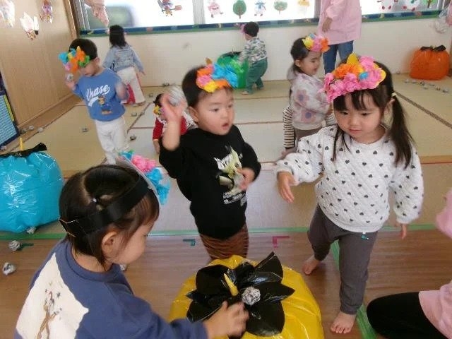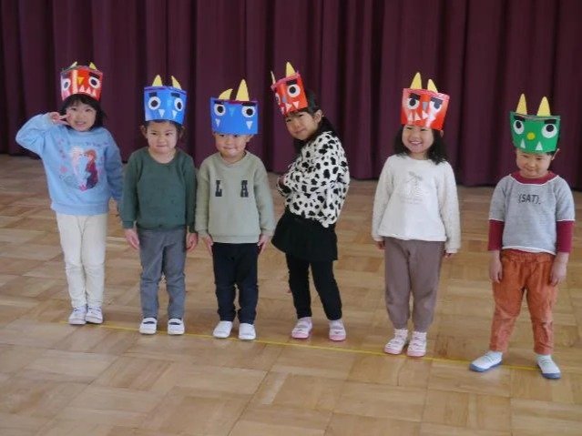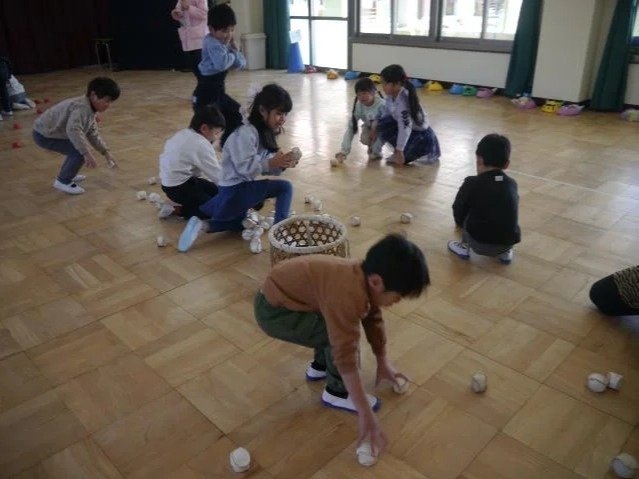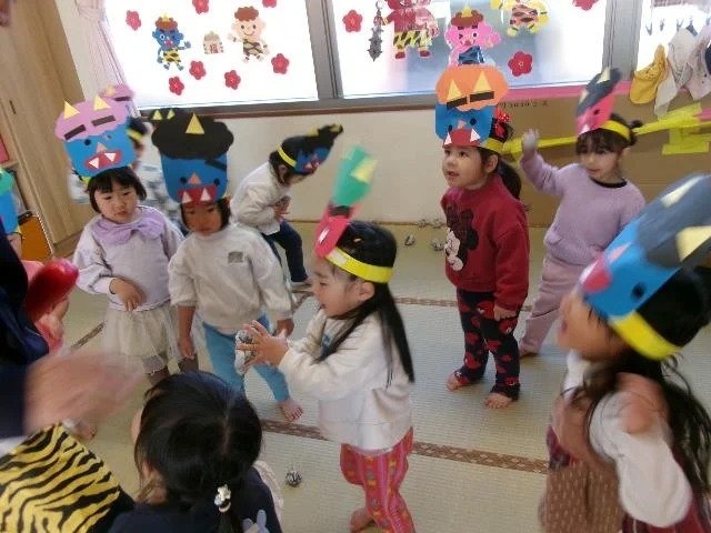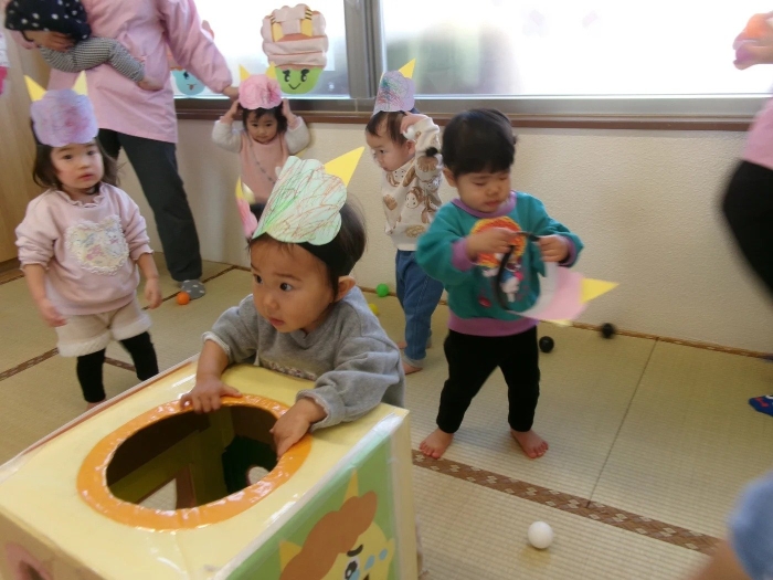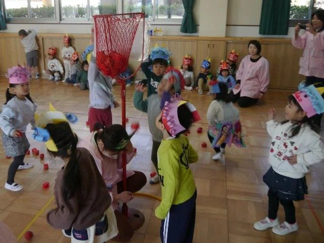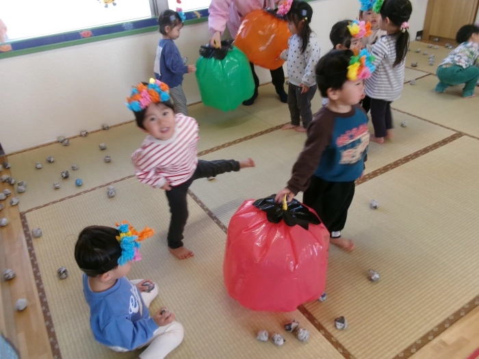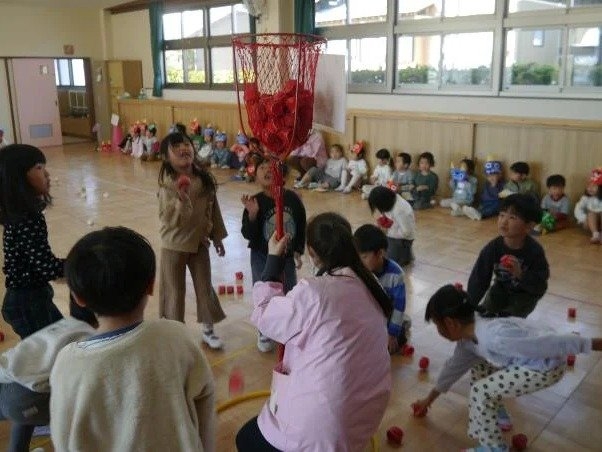 遊戯室に集まって、節分の由来のクイズに挑戦したり、鬼チーム、福の神チームに分かれて「玉入れまめ豆ゲーム」をしたり、鬼のパンツを踊ったりして、異年齢の友達と一緒に楽しみました♪