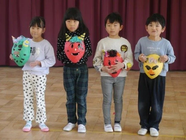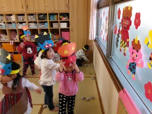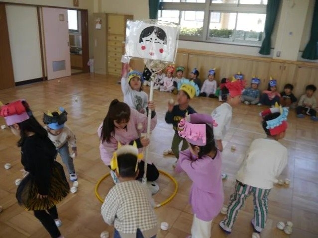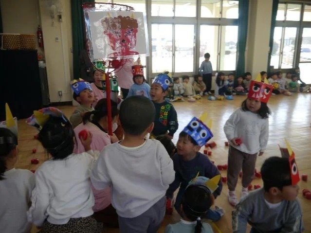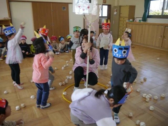 みんなで集まってパネルシアターを見たり、豆まきの歌を歌ったりした後、クラスに分かれて豆まきごっこを楽しみました♪