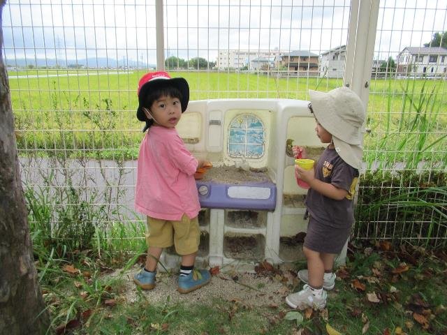 少し涼しくなり、園庭で遊べる日は好きな遊びをを見つけて友達や保育者と一緒に遊んでいます。運動遊びでは、鉄棒や跳び箱等に何度も挑戦しています。砂場では、好きな食べ物に見立てて、「どうぞ」「食べて」と友達とやり取りを楽しんでいます。またダンゴムシやハサミムシ等の虫を見つけると、「この虫、知っているよ」「見せて」と観察しています。「また明日も遊ぼう」と園庭で遊べることを楽しみにしている子どもたちです。