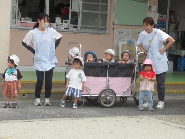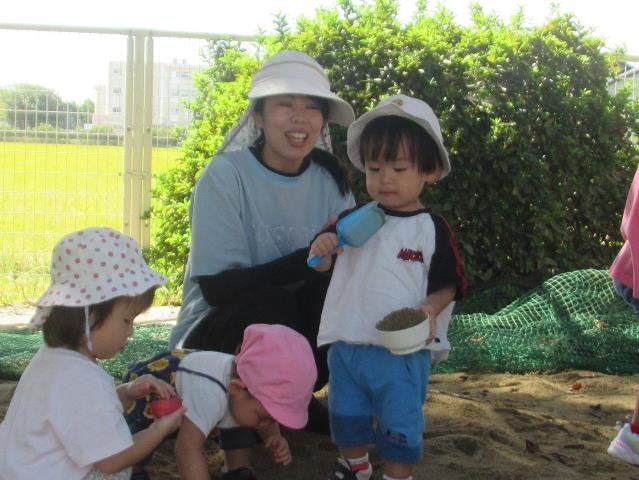 低年齢児組さんは安心して過ごせるようになってきました。保育者がバギーを出すと喜んで乗ったり、砂場で砂をすくったりして遊んでいます。