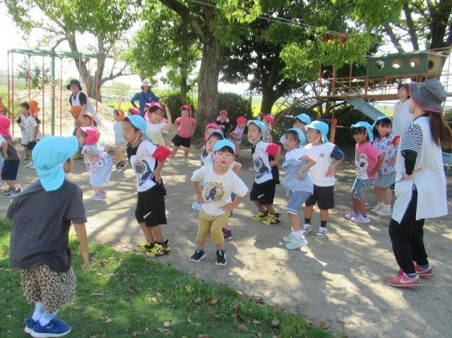 幼児組の子どもたちは、園庭で好きな遊びを見つけ、保育者や友達と一緒に楽しんでいます。片付けの後の体操も保育者の真似をして前に出て、みんなが楽しい雰囲気の中で体を動かしています。