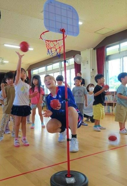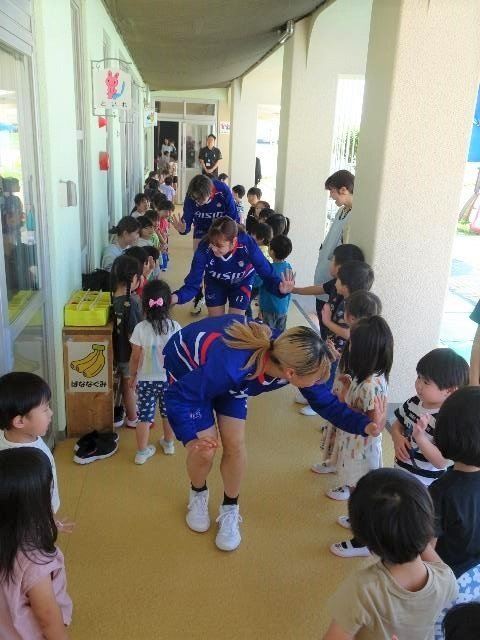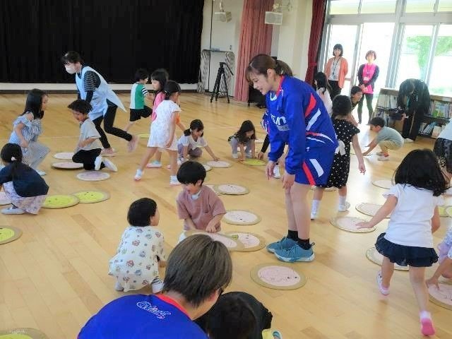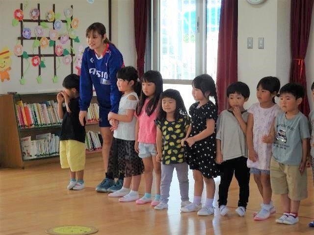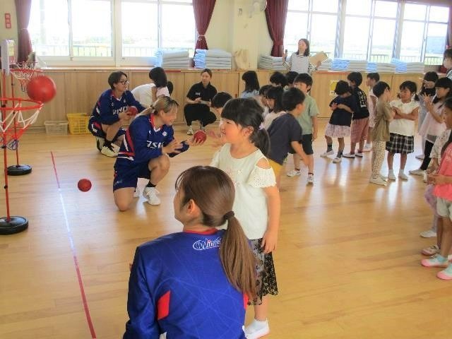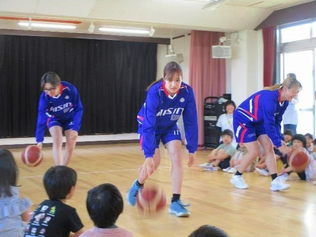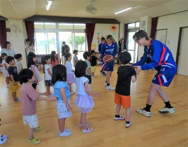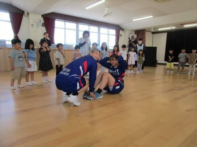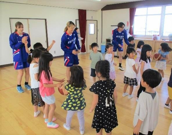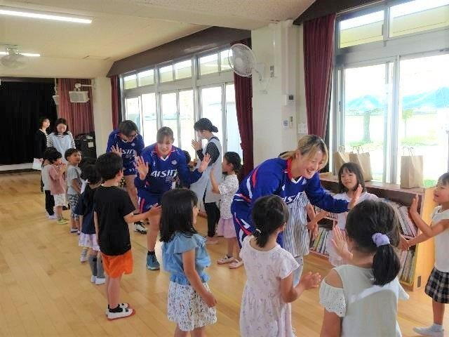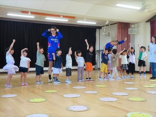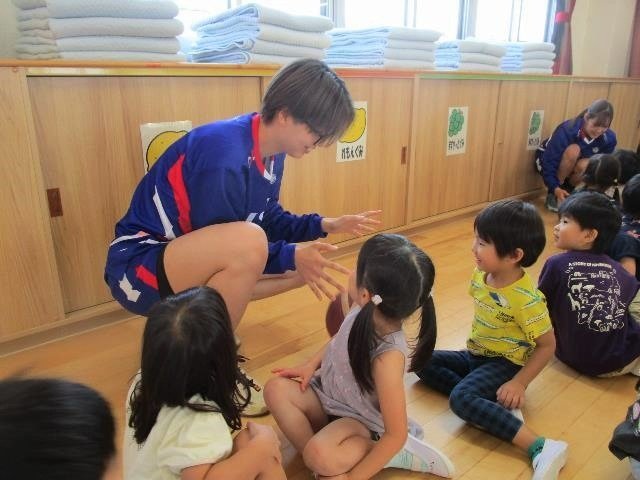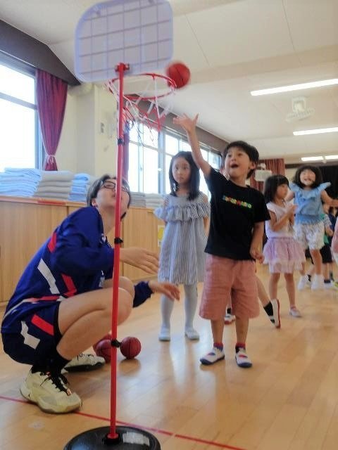 6/4(火)に、「スポーツ選手と遊ぼう!」でバスケットボールチーム「アイシンウィングス」の選手3名が園に来てくれました。デモンストレーションでは、お姉さん達の得意なドリブルやパスなどを見せもらい、本物のバスケットボールに大興奮の子どもたち!どの子も積極的にボールに触れていました。