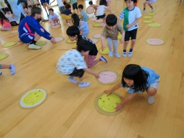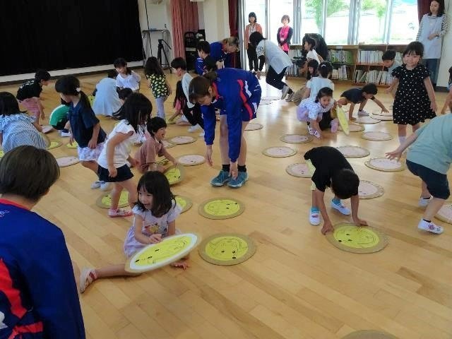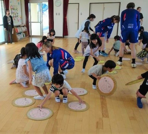 ボール運びリレーの後は、2チームに分かれて子どもたちの大好きなオセロゲームをお姉さんたちと一緒に行いました。素早くオセロをひっくり返す子どもたちの姿にお姉さんたちもびっくり!力を合わせて頑張り、チーム対抗戦を楽しみました♬