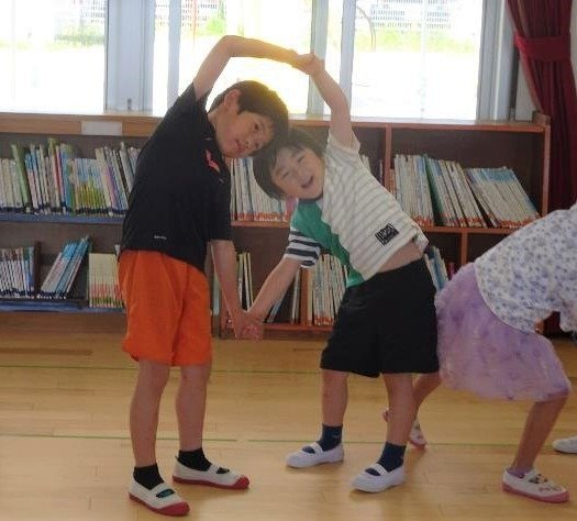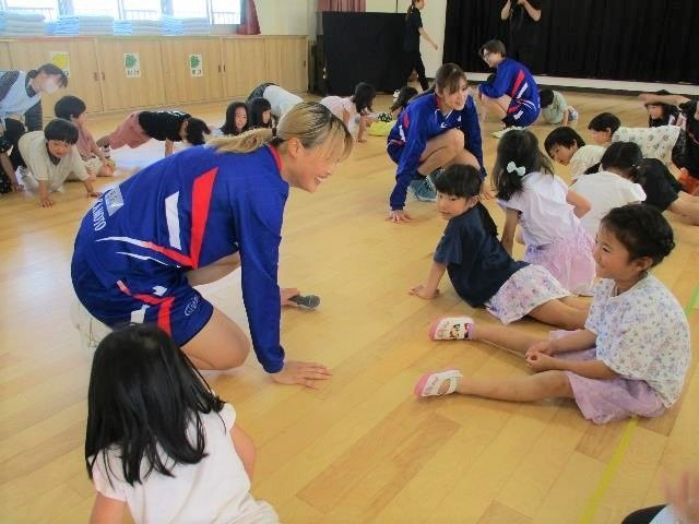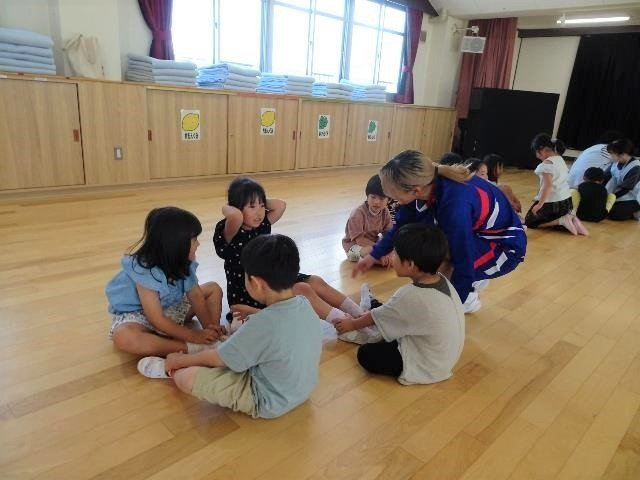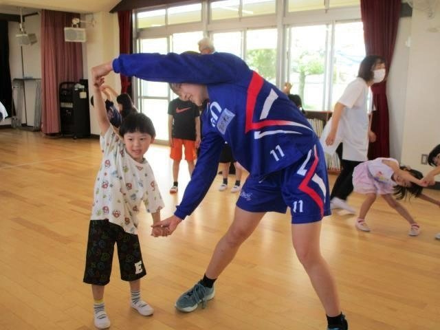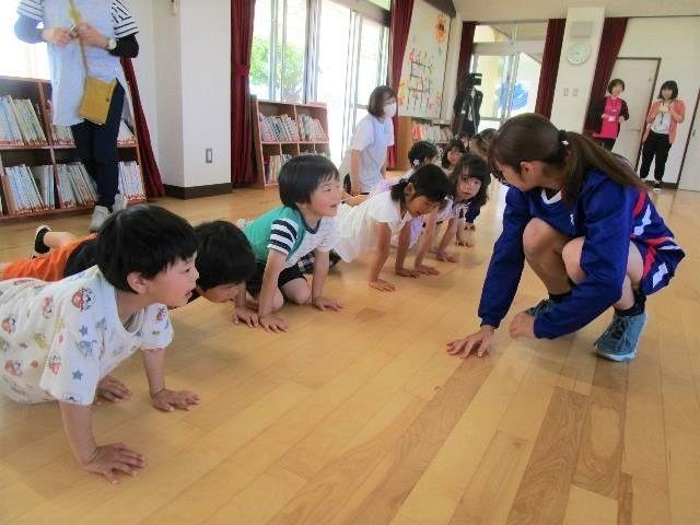 年長児は、お姉さん達が日頃行っているストレッチやトレーニングを教えてもらいました。お姉さんたちが見本を見せてくれると、すぐに真似してやってみようと積極的な子どもたち!どこを伸ばすといいのか、どこに力を入れるといいのかなどポイントを聞き、「見て見て!できたよ!」と得意気に披露していました。お姉さんたちとの会話も弾み、楽しそうな子どもたちでした。