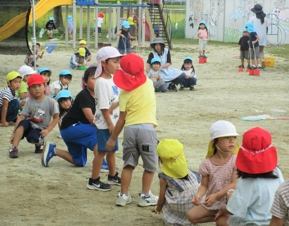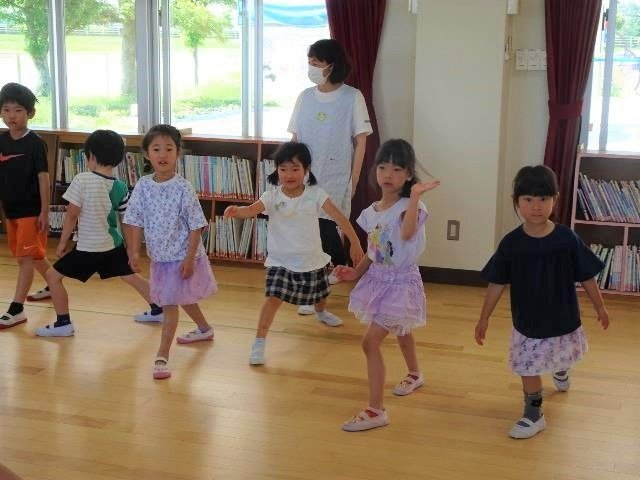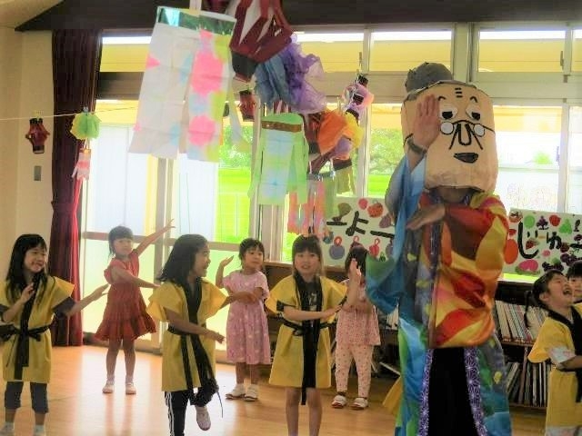 SDGsの取り組みとして、“もったいないばあさん”の絵本を通して身近な“もったいない”について考え始めていた子どもたち。夏祭り会では本物の“もったいないばあさん”も登場し、一緒にを踊ることでさらに“もったいないばあさん”への親しみをもつことができました。これからも、いろいろなきっかけを通して身近な資源(水や紙など)を大切にしていけるように年齢に合わせた取り組みをしたり、みんなで楽しくSDGsについて学んだりしていこう思います。