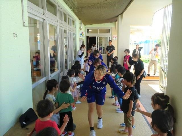 最後はみんなでお礼の気持ちを伝え、年中児、年少児も一緒に花道をつくってお見送りをしました。優しいお姉さんたちとタッチができて大満足な子どもたち♪ 「ありがとう!」「また来てね!」の声がいっぱいで、最後まで笑顔いっぱいの楽しい時間を過ごすことができました!