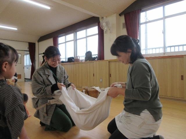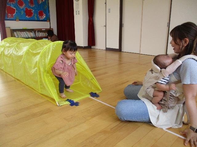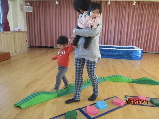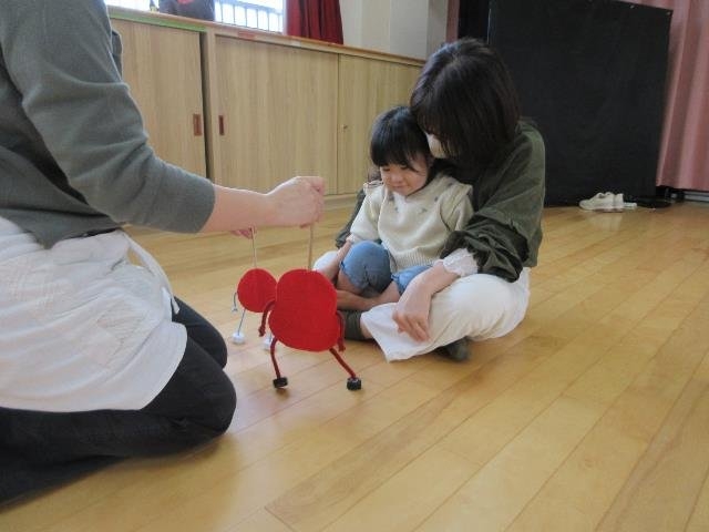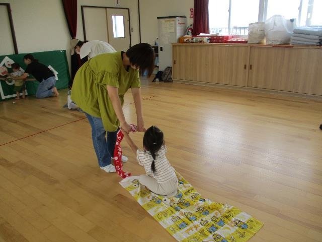 ☆保育園の遊戯室で講師の方を招いて親子遊びを楽しみます。
