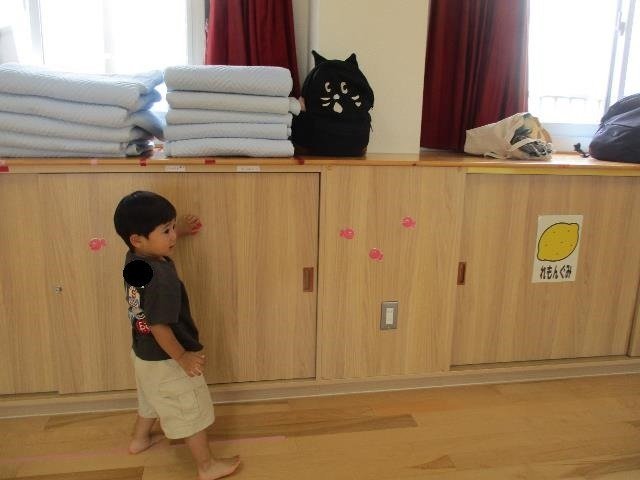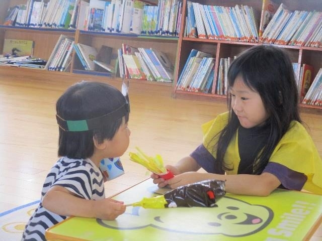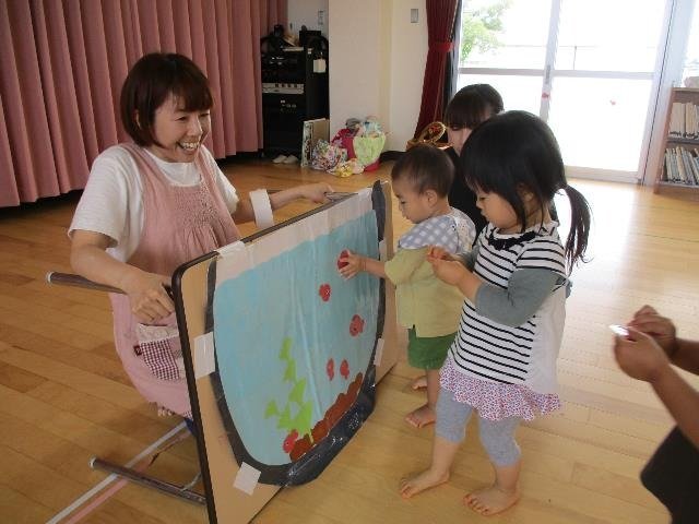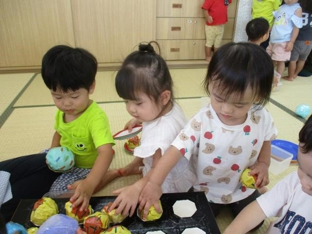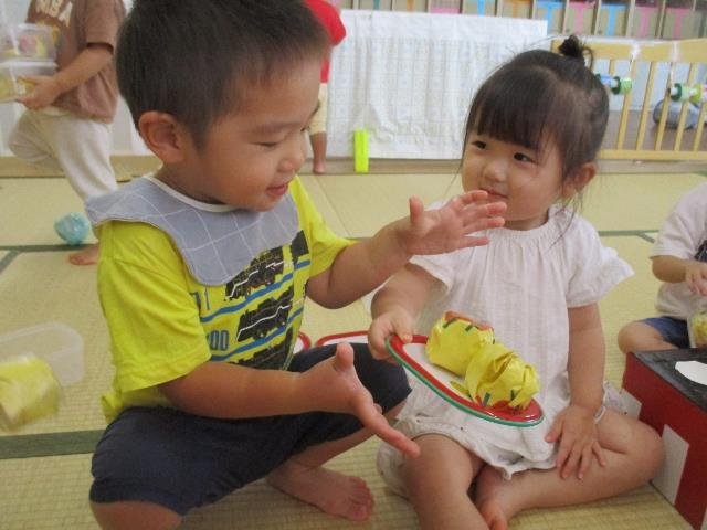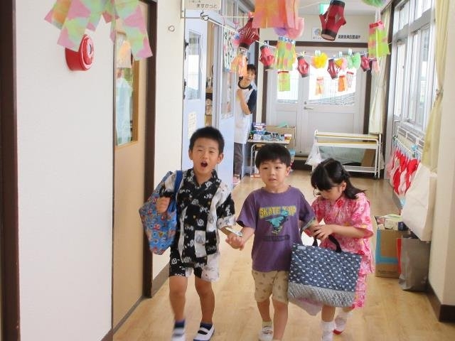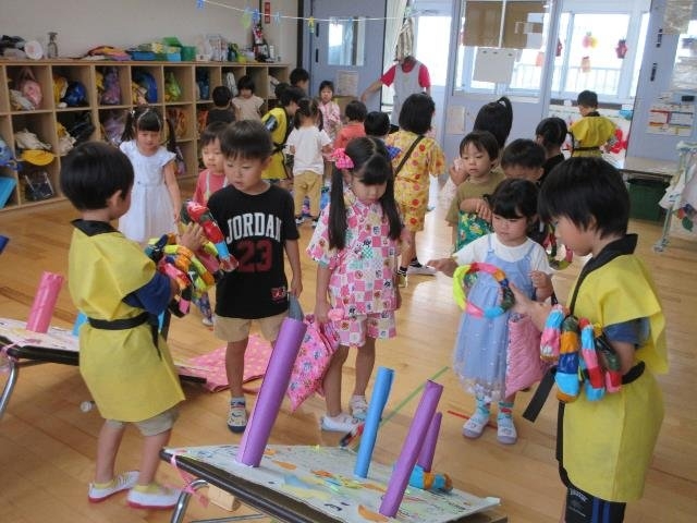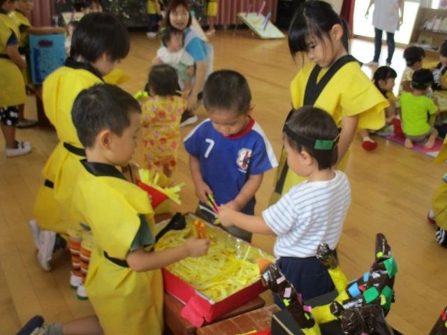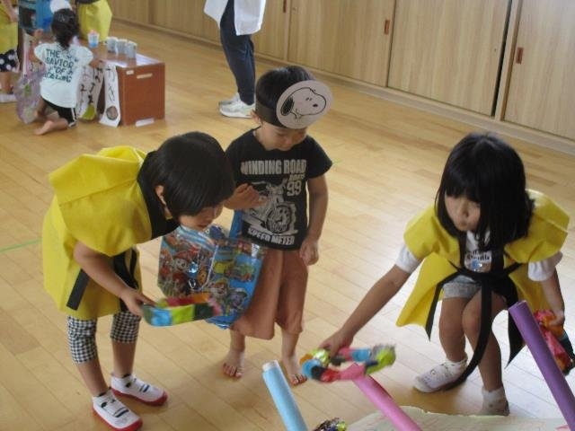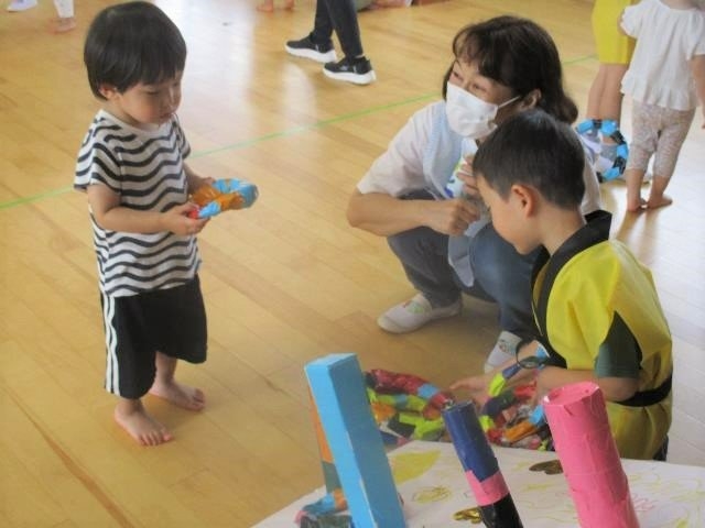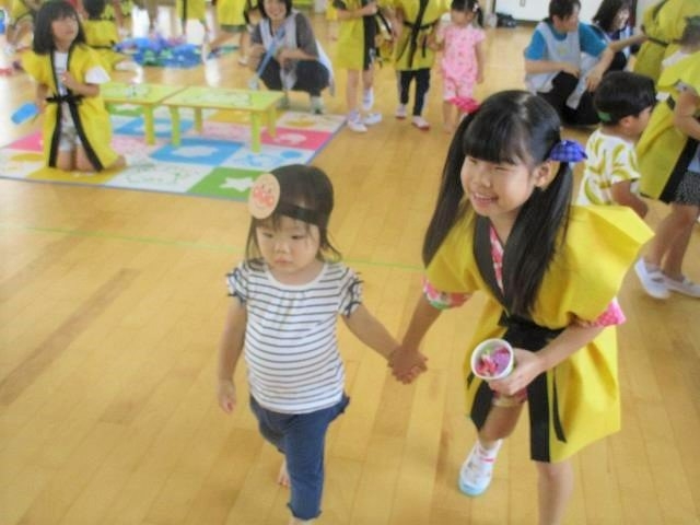 低年齢児は、18日に遊戯室で年齢ごと夏祭り会を楽しみました。黄色の法被を着た年長児が低年齢児一人一人に付き添い、一緒にお店めぐりを楽しんだり、お店の人になって「どれにしますか?」「どうぞ!」などのやり取りをしてくれたりしながら、年下の子たちに優しく関わろうとする姿がとても印象的でした。最初は年長のお兄さん、お姉さんに緊張した表情の子も一緒に遊んでいると安心した表情が見られるようになり、“あっちに行きたい!”と指さしをしたり、年長児の手を“次はこっち!”と引いたりしながらお店めぐりを楽しんでいました♪ 低年齢児にも大好評だった夏祭り会☆ 最後はみんなで「もったいないばあさん音頭」を踊って大盛り上がりの子どもたちでした!